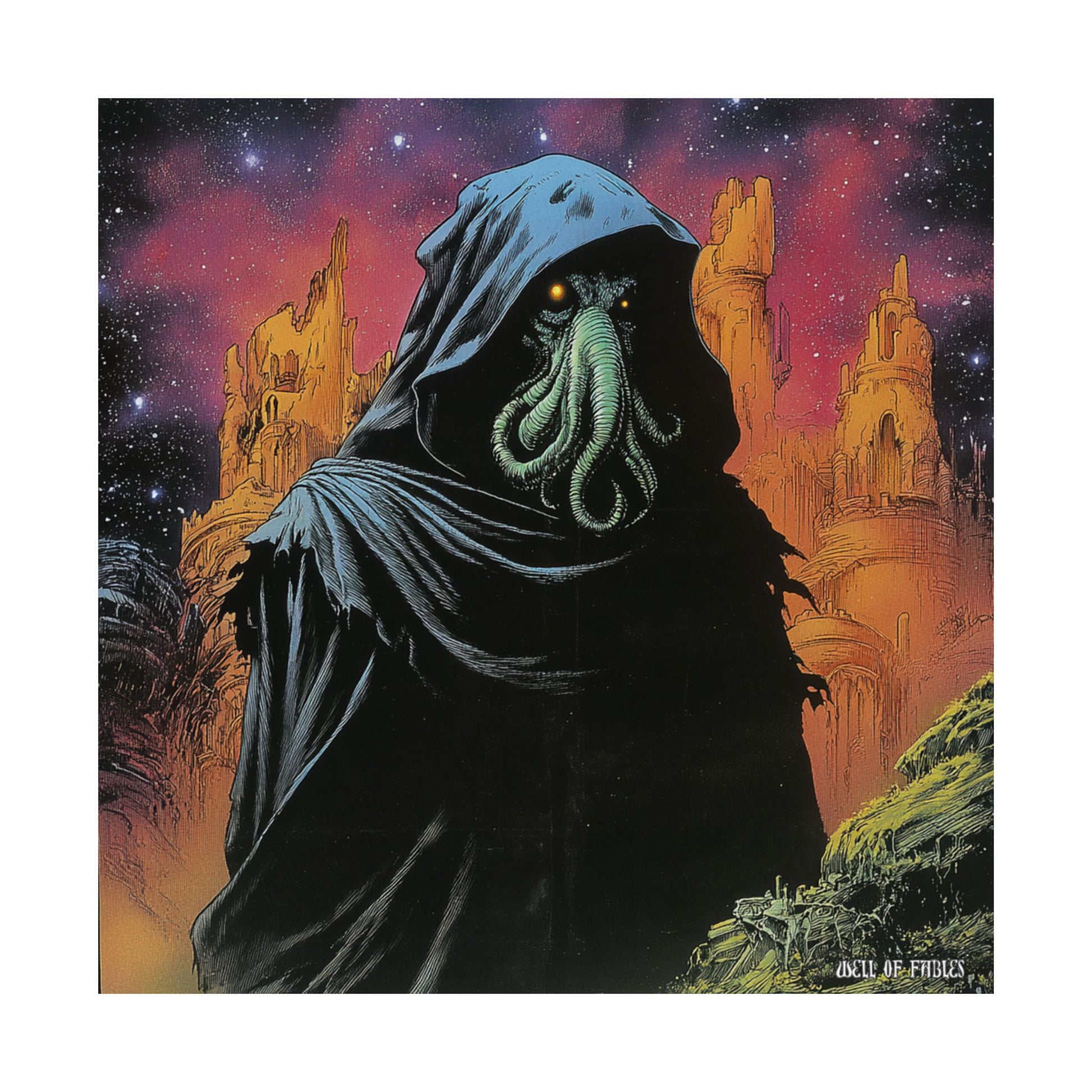 A matte horizontal poster that brings cosmic horror and vintage sci‑fi into your space. Deep, velvety blacks and saturated sunset purples glow from museum‑grade archival paper, while giclée printing keeps the tiny details—twisted tentacles, a shadowed hood, and alien spires—in sharp, fade‑resistant color. Hang it above a record player, beside a reading chair, or in a den where story nights and late‑night worldbuilding happen. The muted matte finish reduces glare and gives the scene a tactile, illustrated look that reads like a rediscovered pulp magazine cover.