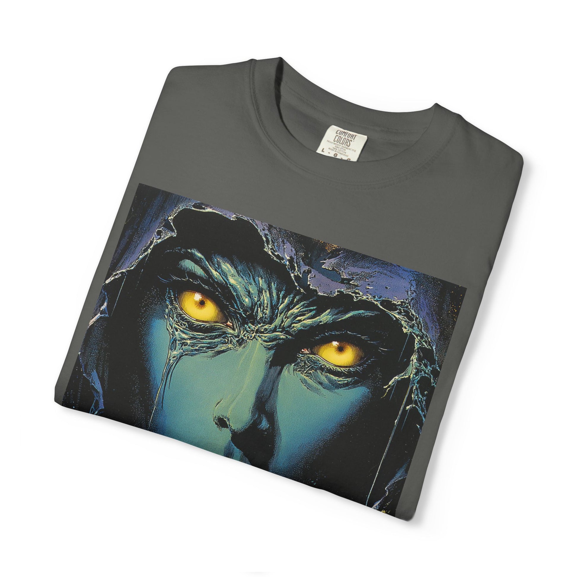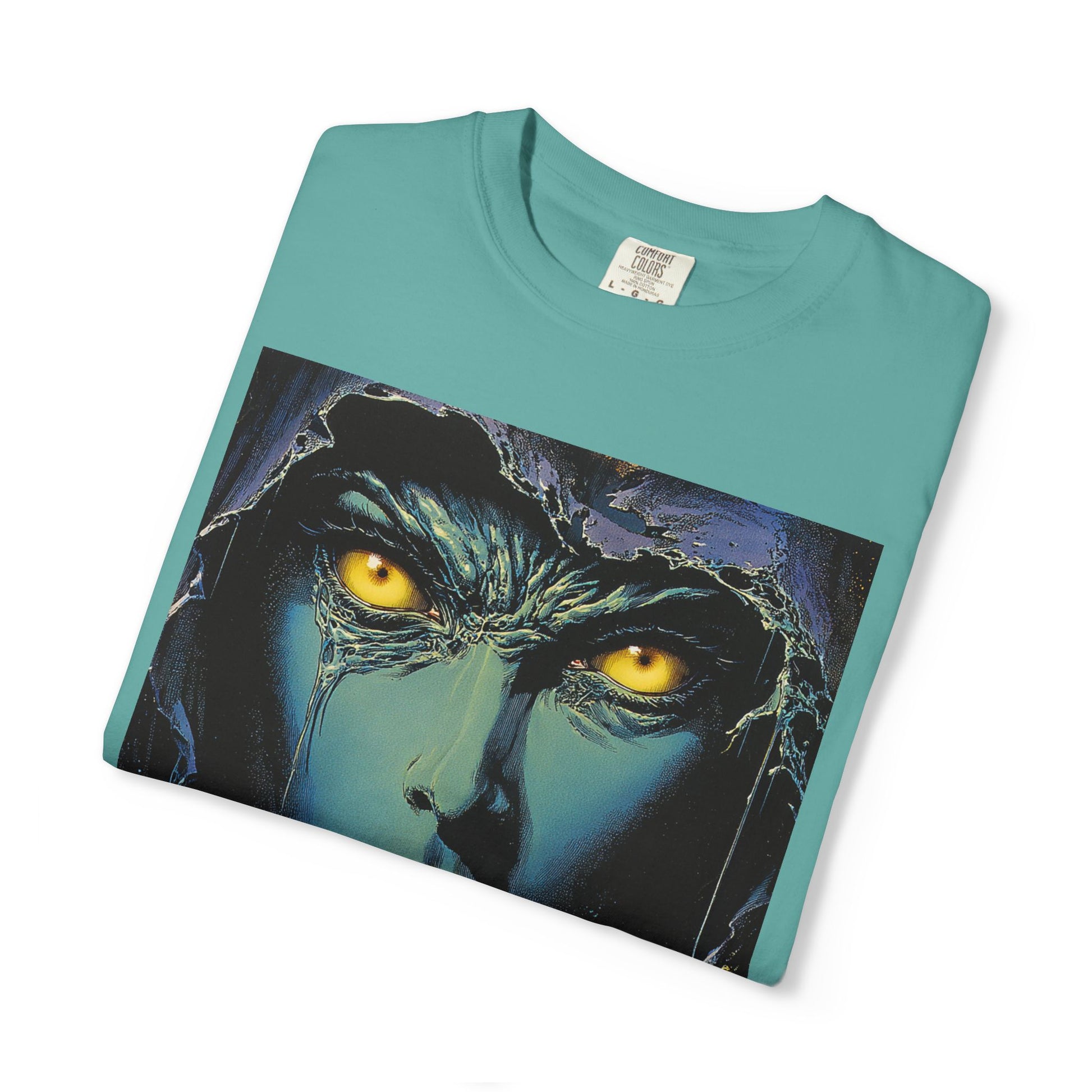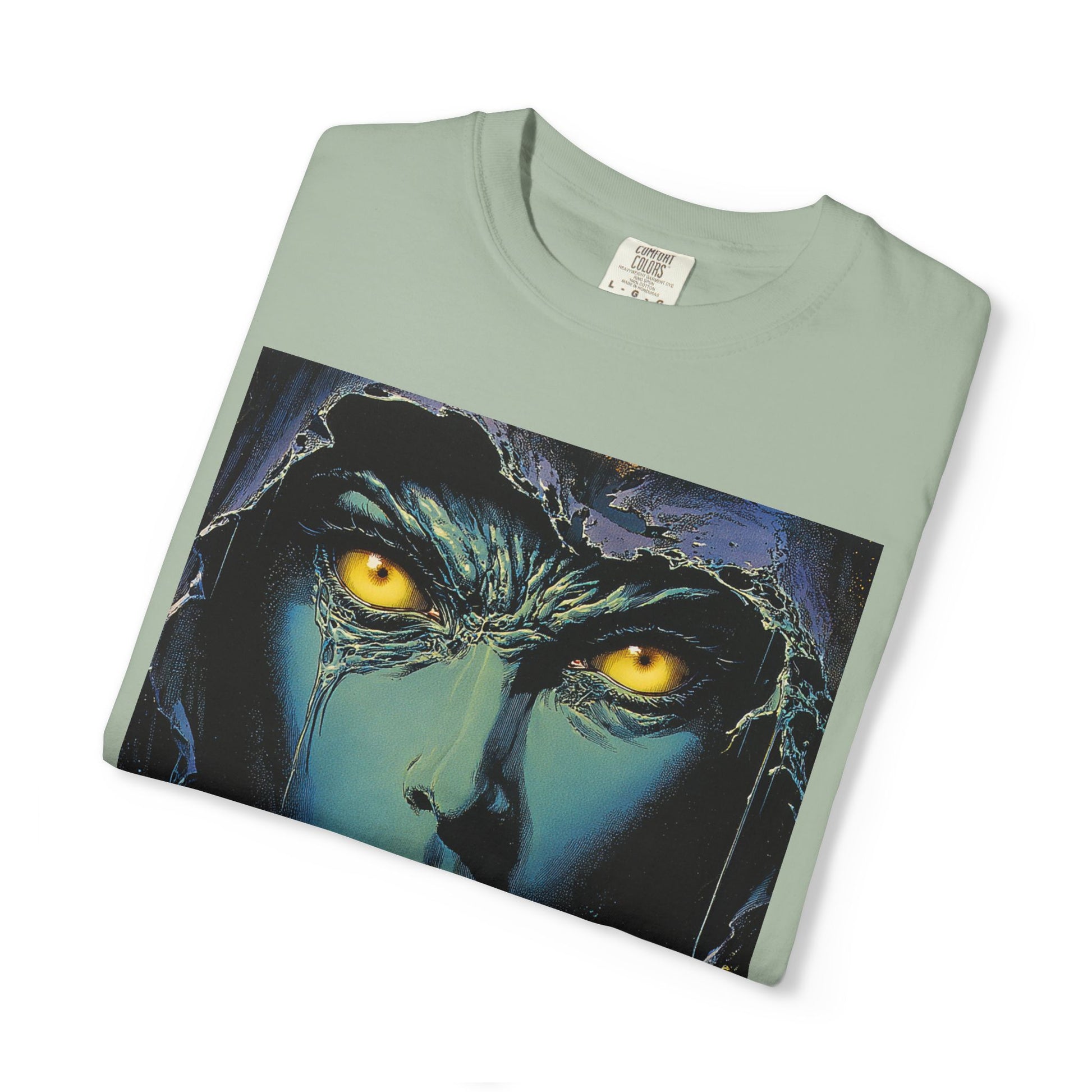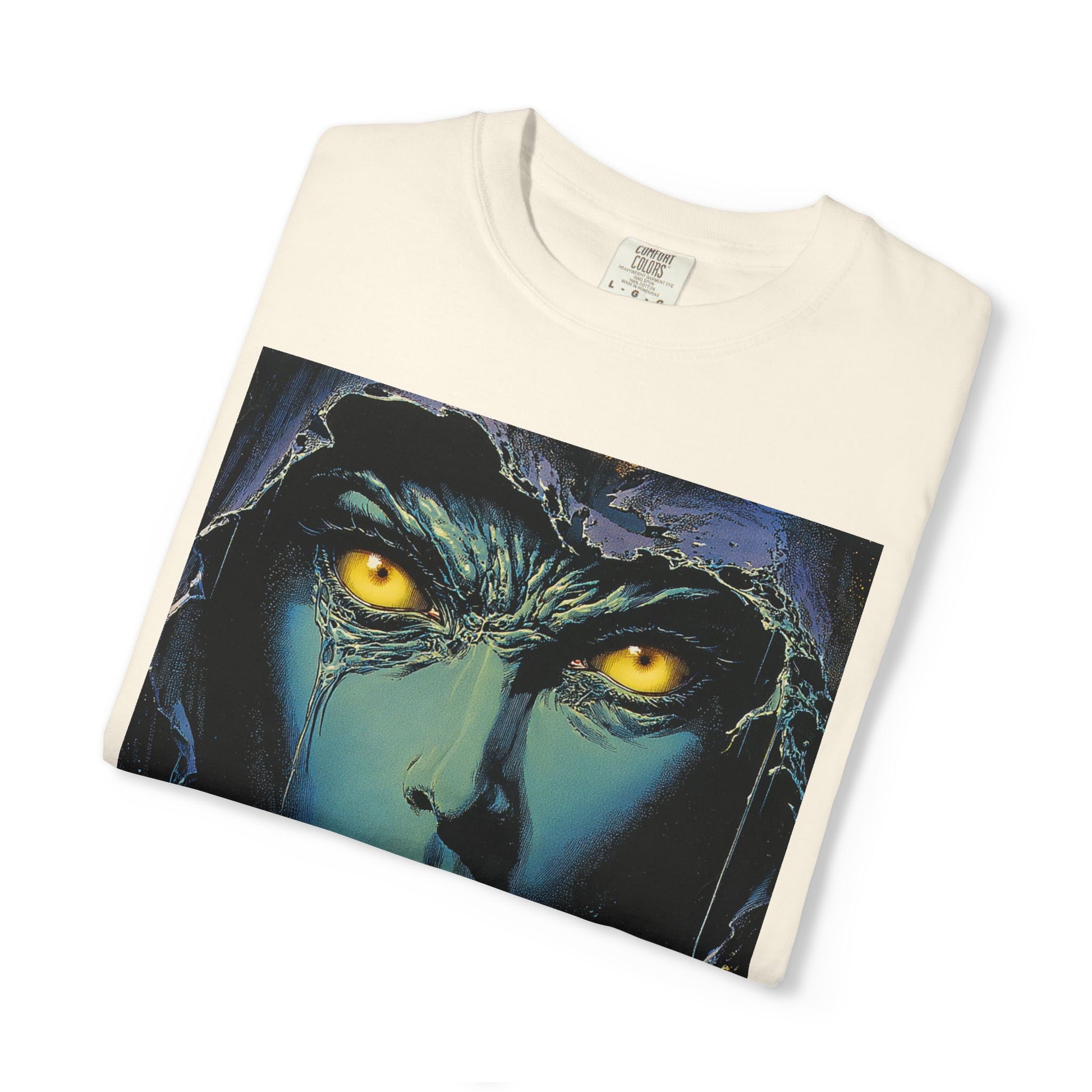 This shirt carries a quiet, edgy energy — a heavyweight, garment-dyed tee with a striking, cinematic face printed on the chest. The printed artwork’s glowing yellow eyes and shadowed teal skin draw the eye and hold it, giving the tee a mysterious, nocturnal vibe. It feels lived-in from the first wear: soft, slightly faded color from post-construction dyeing, with sturdy double-needle seams and a relaxed, roomy cut. Wear it to late-night shows, city walks, or when you want to add a brooding focal point to a layered outfit. The knit construction and pre-shrunk ring-spun cotton make it dependable wash after wash, while the sewn-in label and lack of side seams keep the silhouette clean and simple.