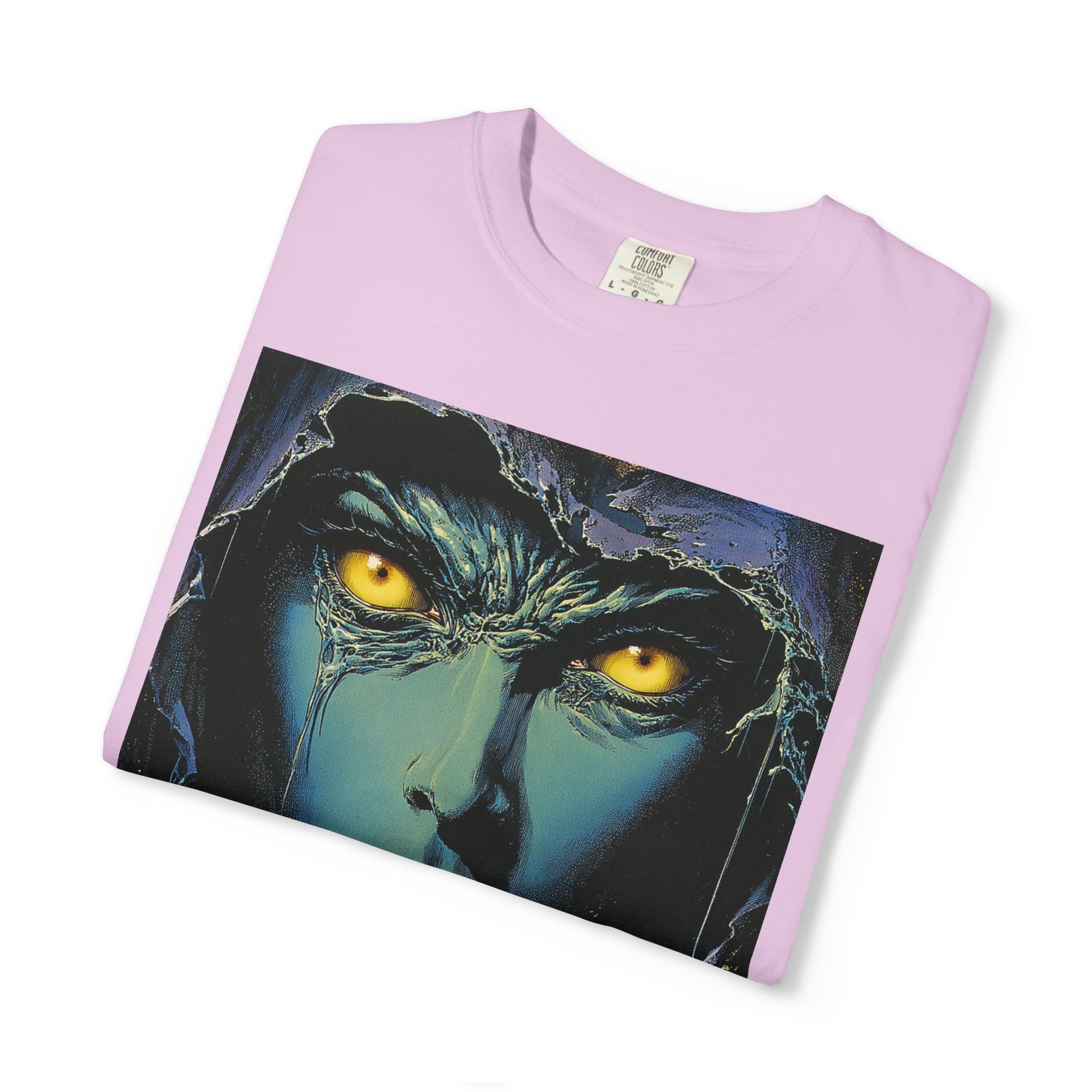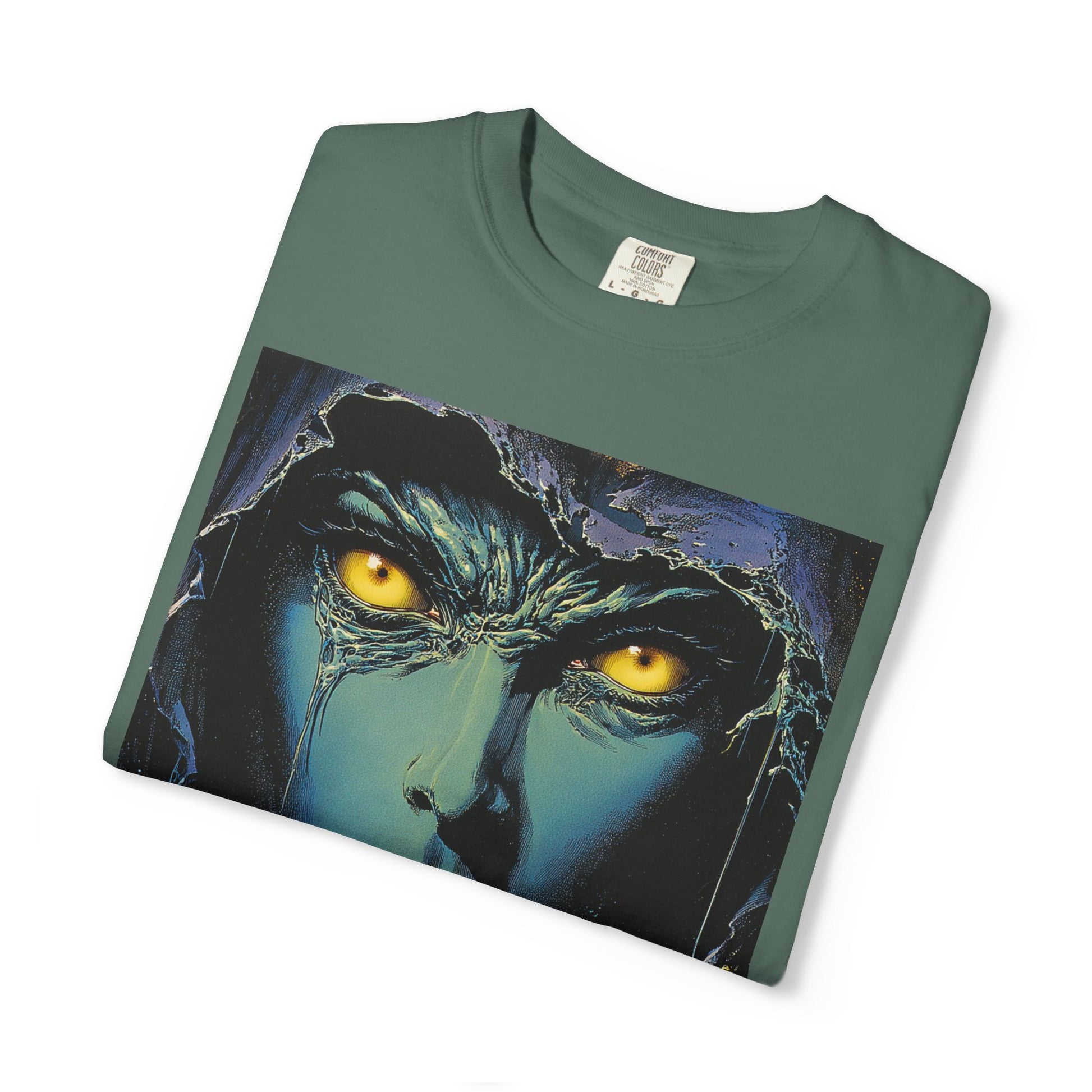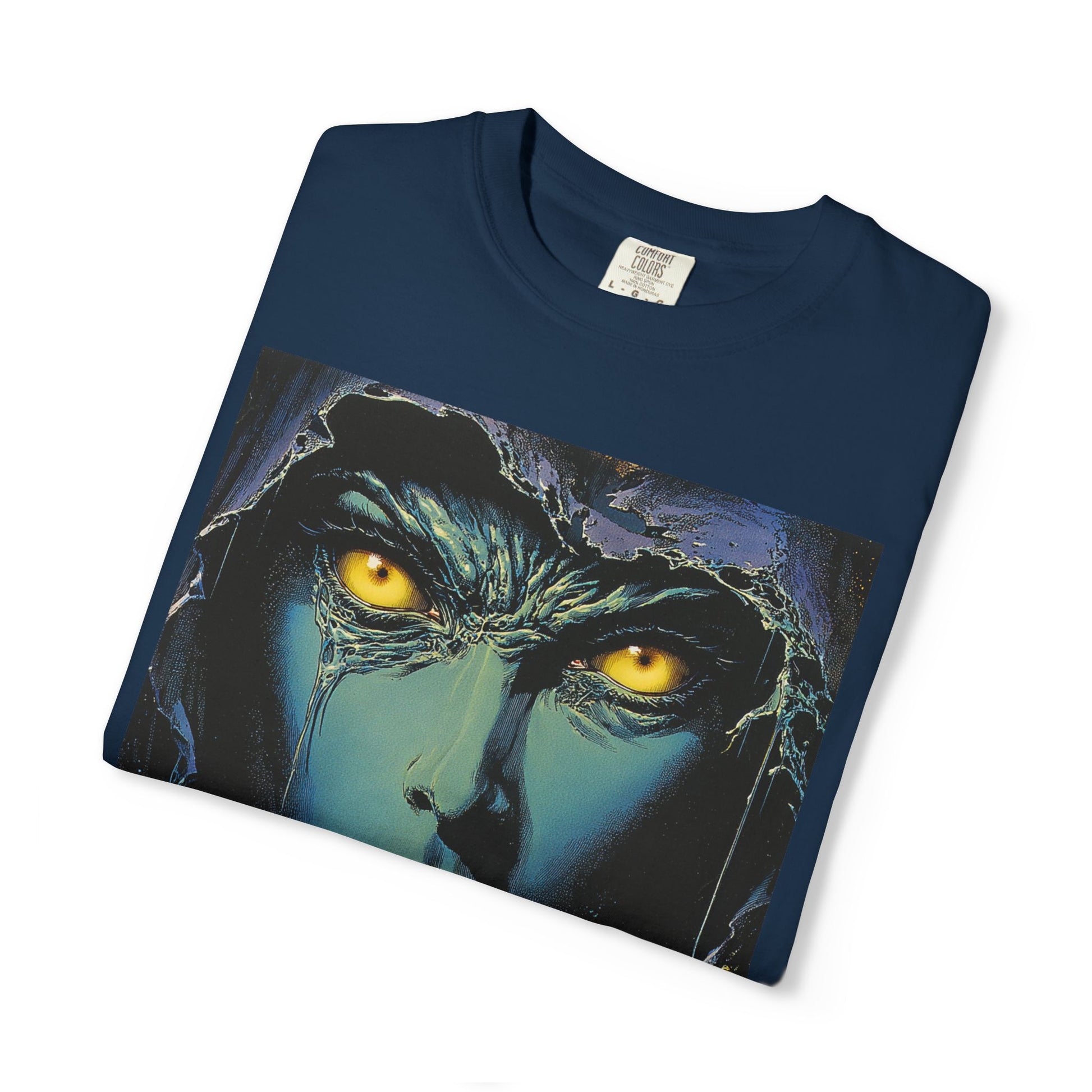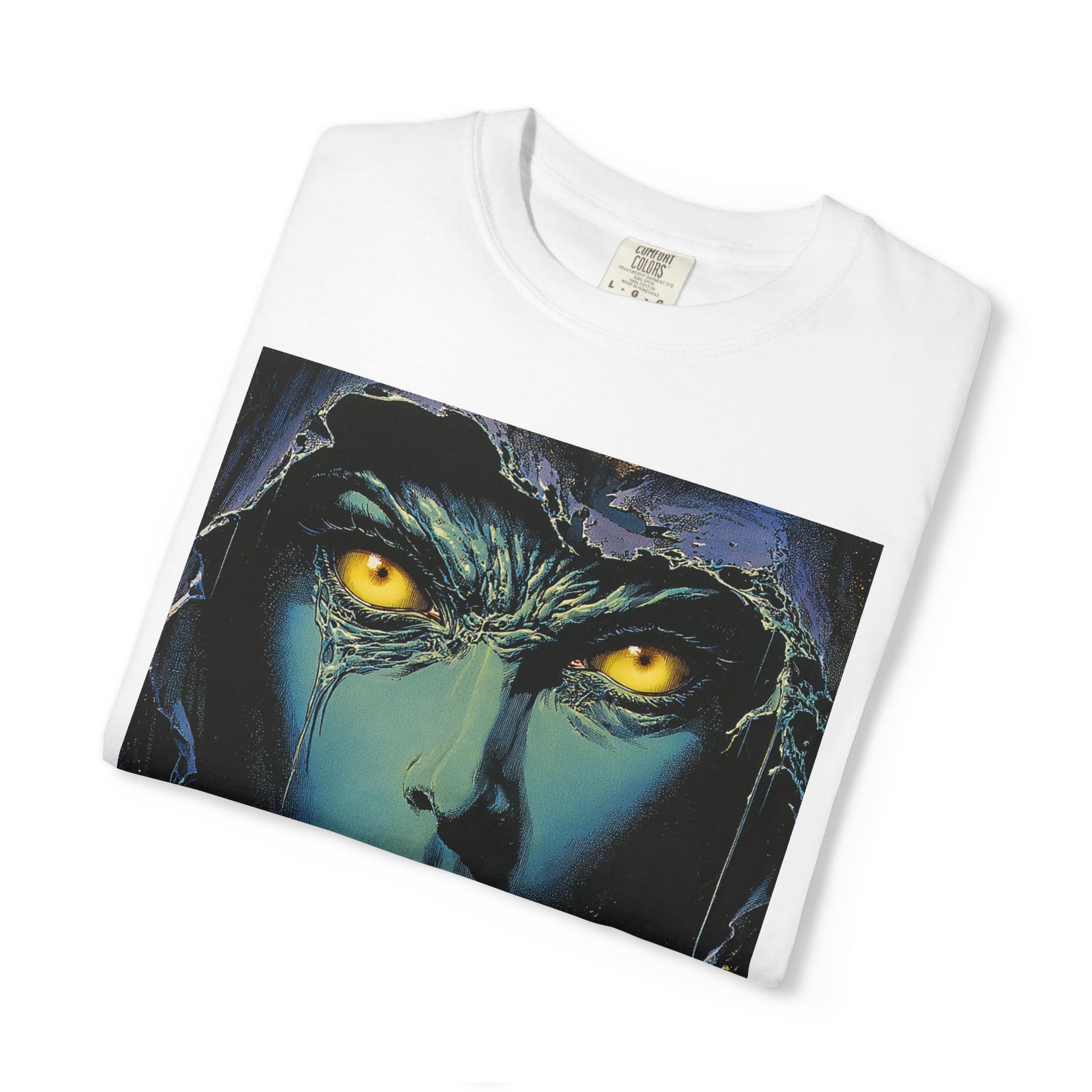 This shirt carries a quiet, edgy energy — a heavyweight, garment-dyed tee with a striking, cinematic face printed on the chest. The printed artwork’s glowing yellow eyes and shadowed teal skin draw the eye and hold it, giving the tee a mysterious, nocturnal vibe. It feels lived-in from the first wear: soft, slightly faded color from post-construction dyeing, with sturdy double-needle seams and a relaxed, roomy cut. Wear it to late-night shows, city walks, or when you want to add a brooding focal point to a layered outfit. The knit construction and pre-shrunk ring-spun cotton make it dependable wash after wash, while the sewn-in label and lack of side seams keep the silhouette clean and simple.