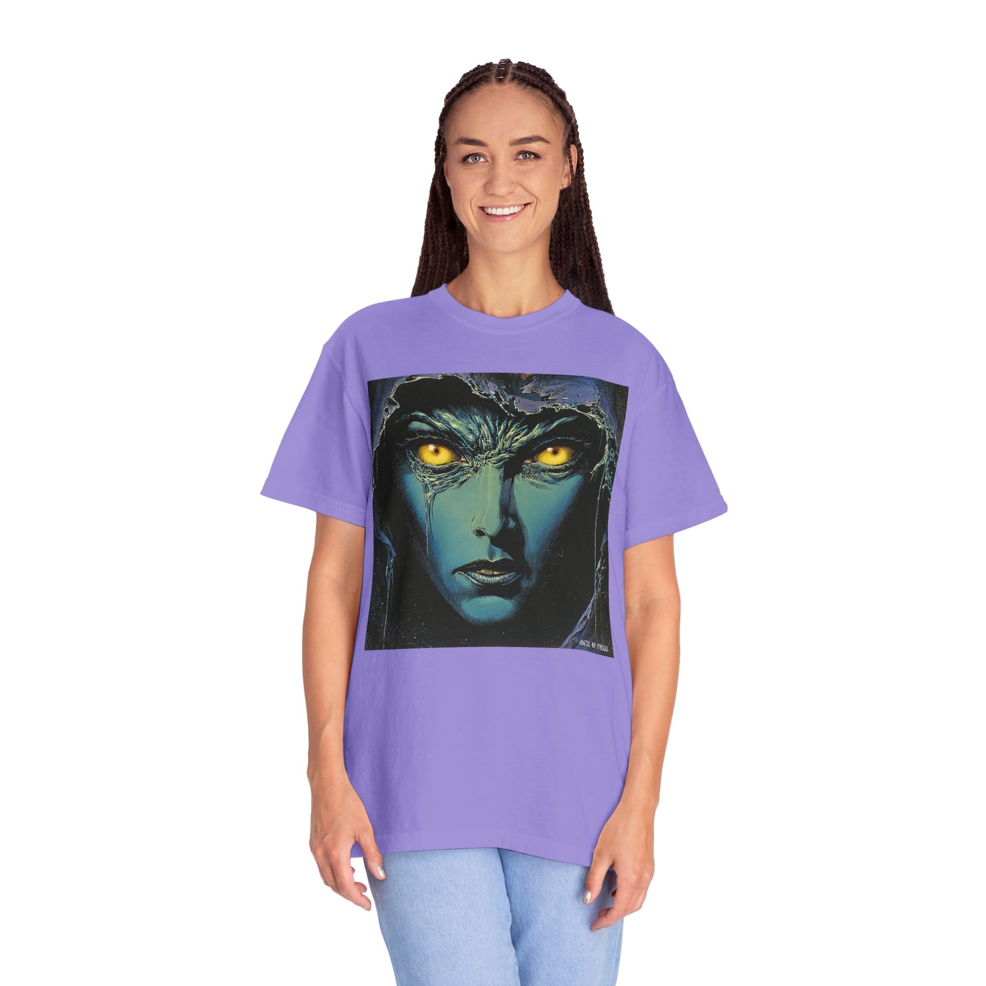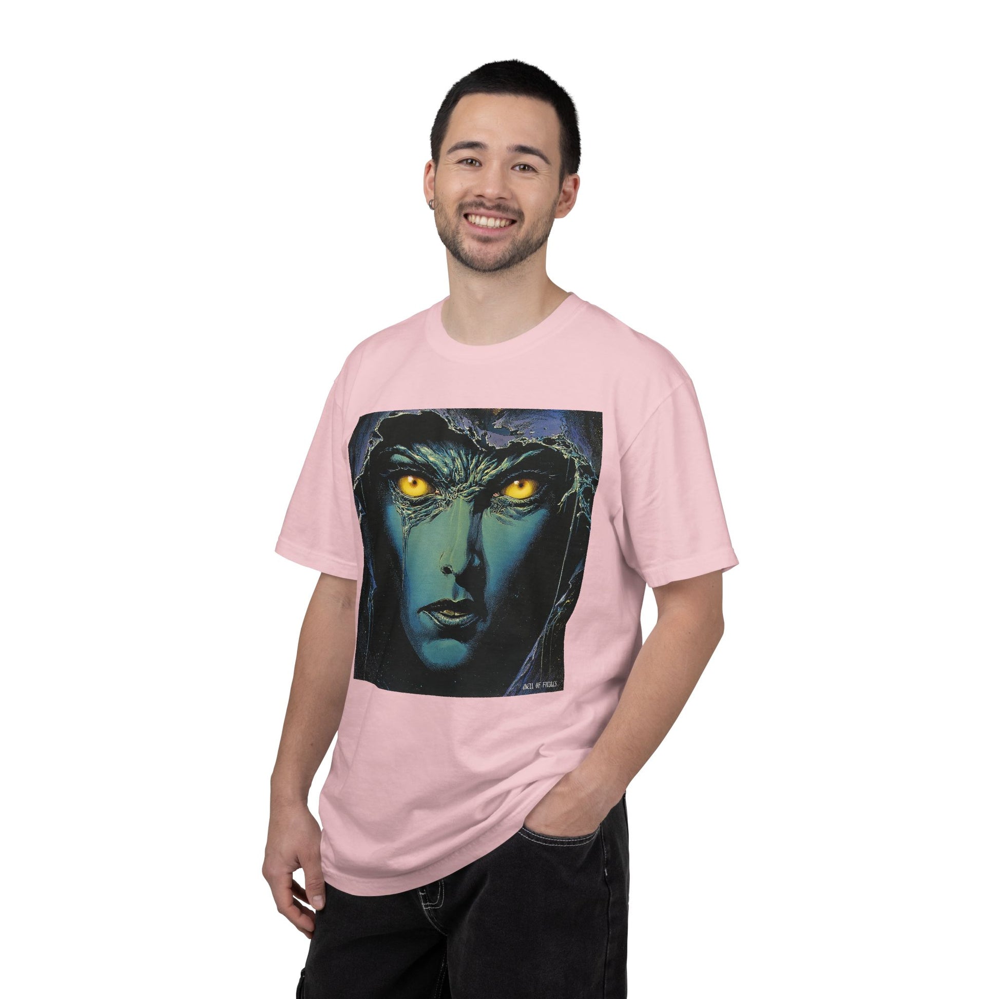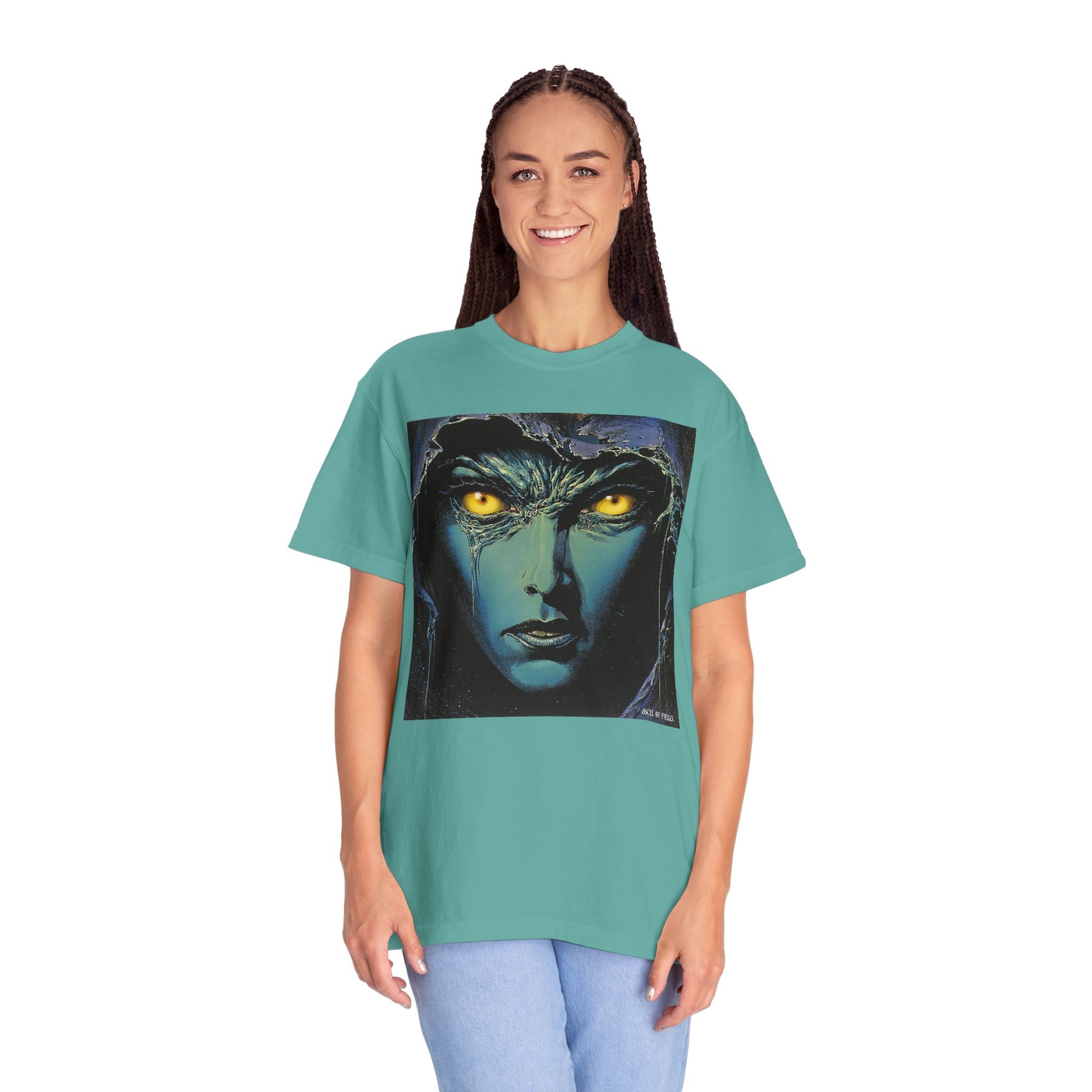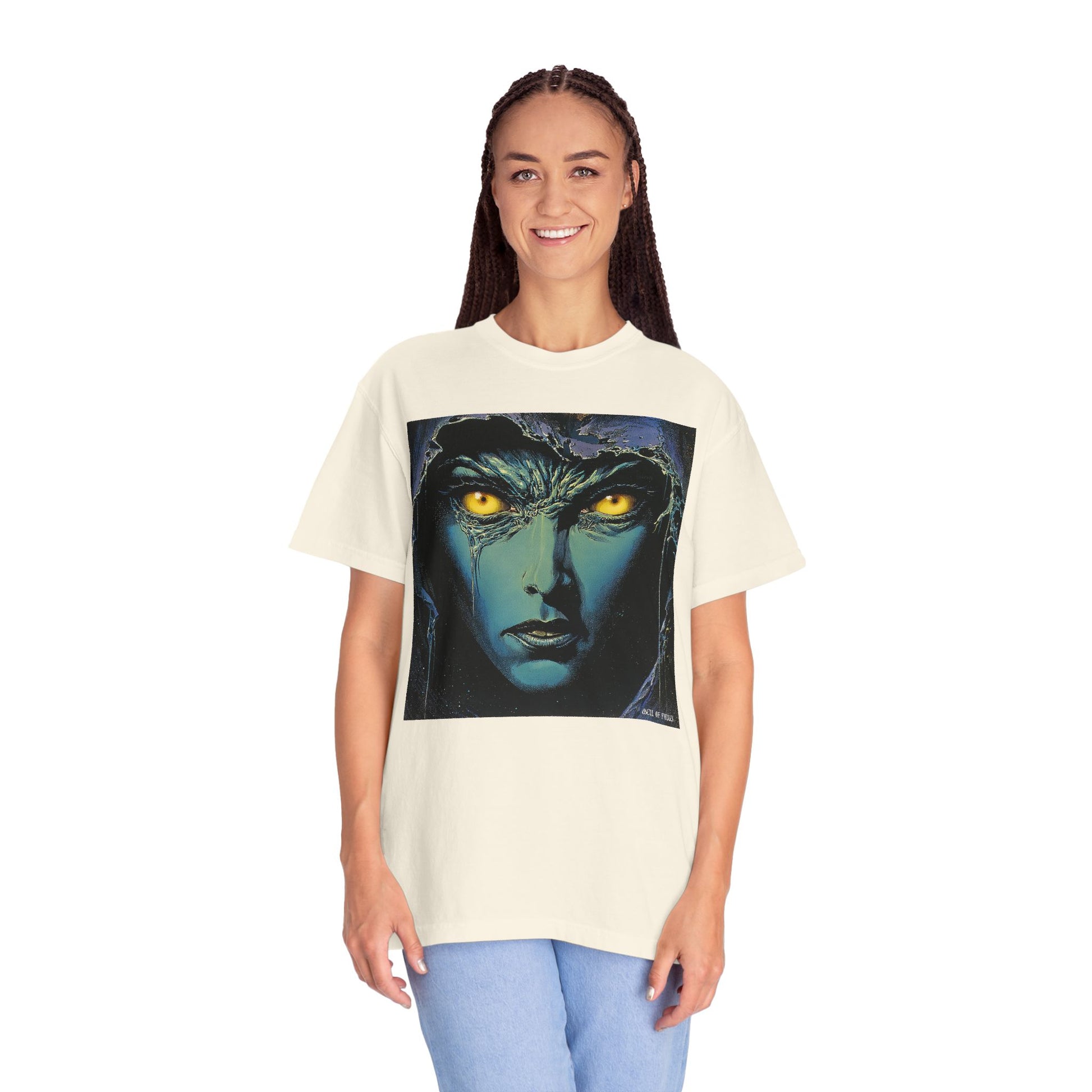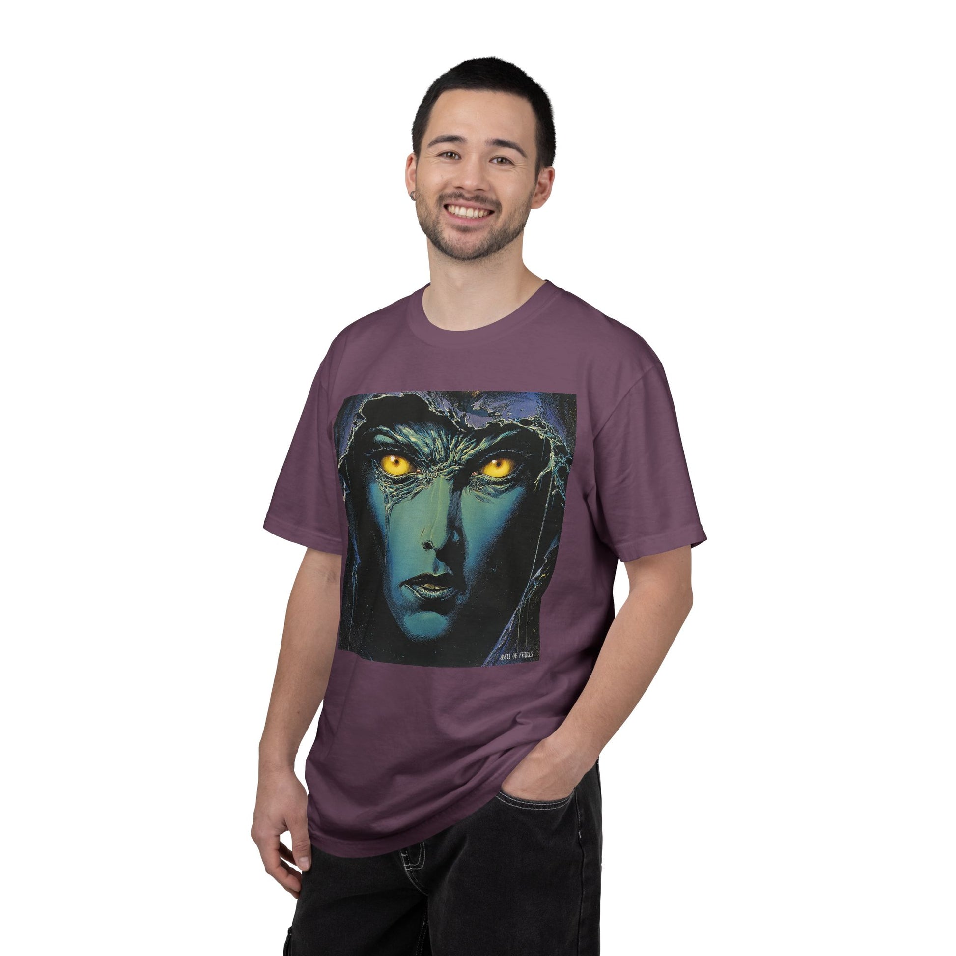This shirt carries a quiet, edgy energy — a heavyweight, garment-dyed tee with a striking, cinematic face printed on the chest. The printed artwork’s glowing yellow eyes and shadowed teal skin draw the eye and hold it, giving the tee a mysterious, nocturnal vibe. It feels lived-in from the first wear: soft, slightly faded color from post-construction dyeing, with sturdy double-needle seams and a relaxed, roomy cut. Wear it to late-night shows, city walks, or when you want to add a brooding focal point to a layered outfit. The knit construction and pre-shrunk ring-spun cotton make it dependable wash after wash, while the sewn-in label and lack of side seams keep the silhouette clean and simple.