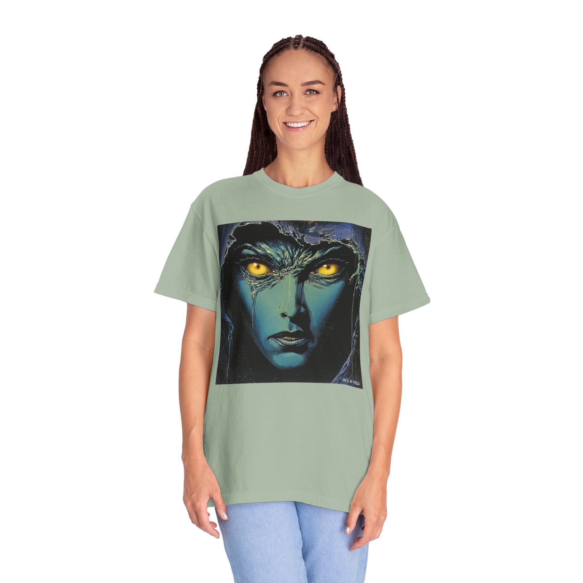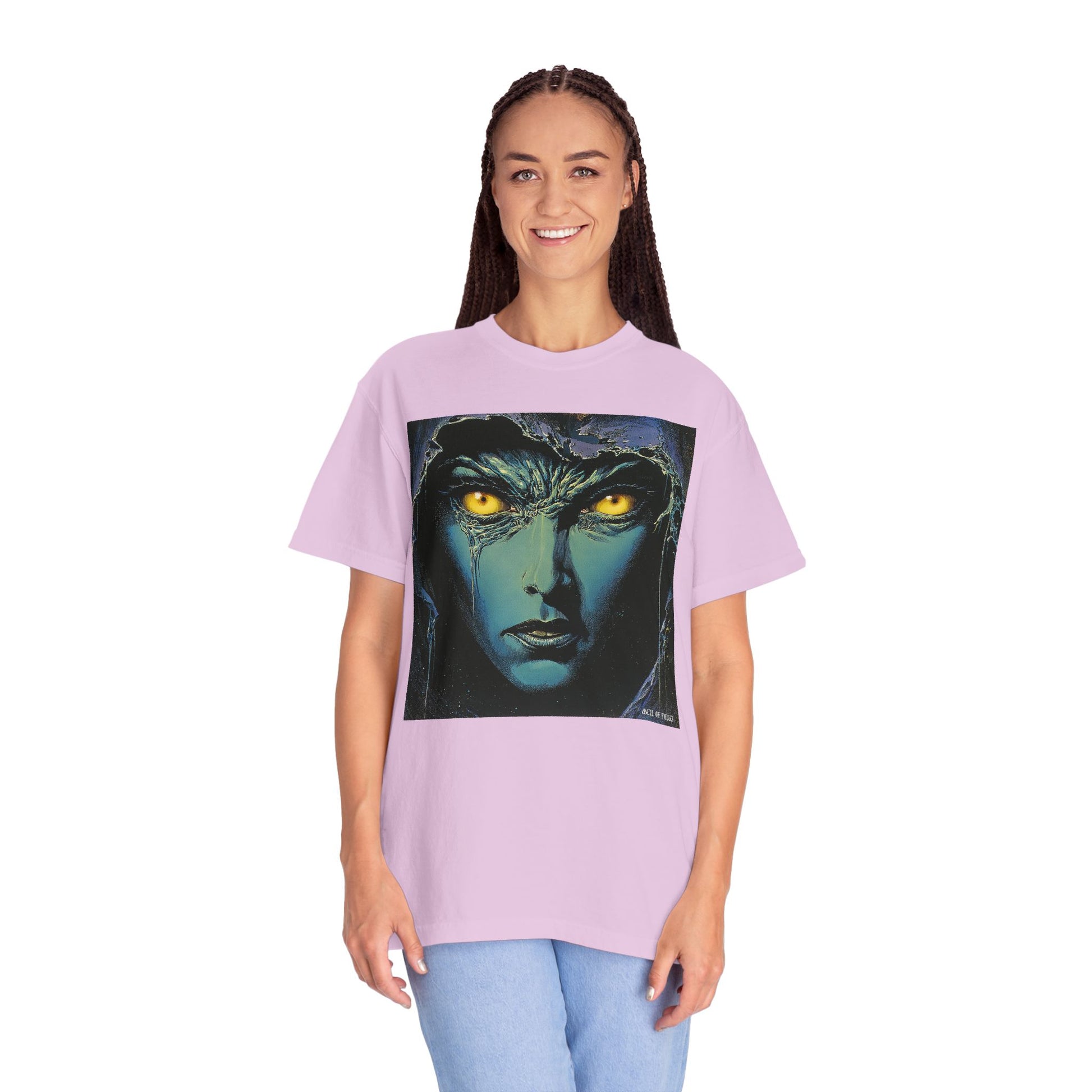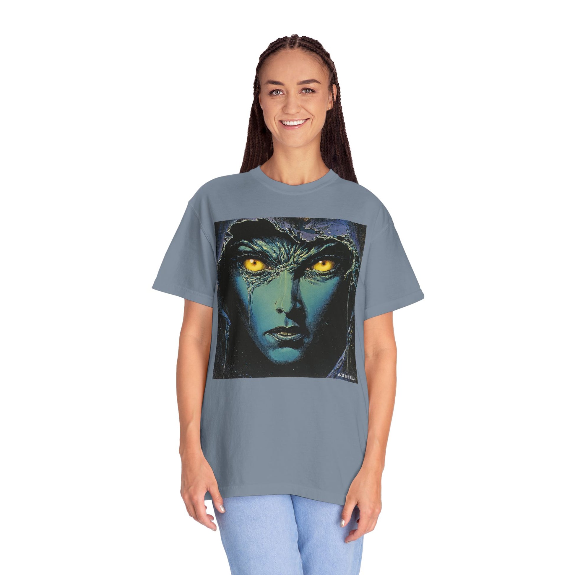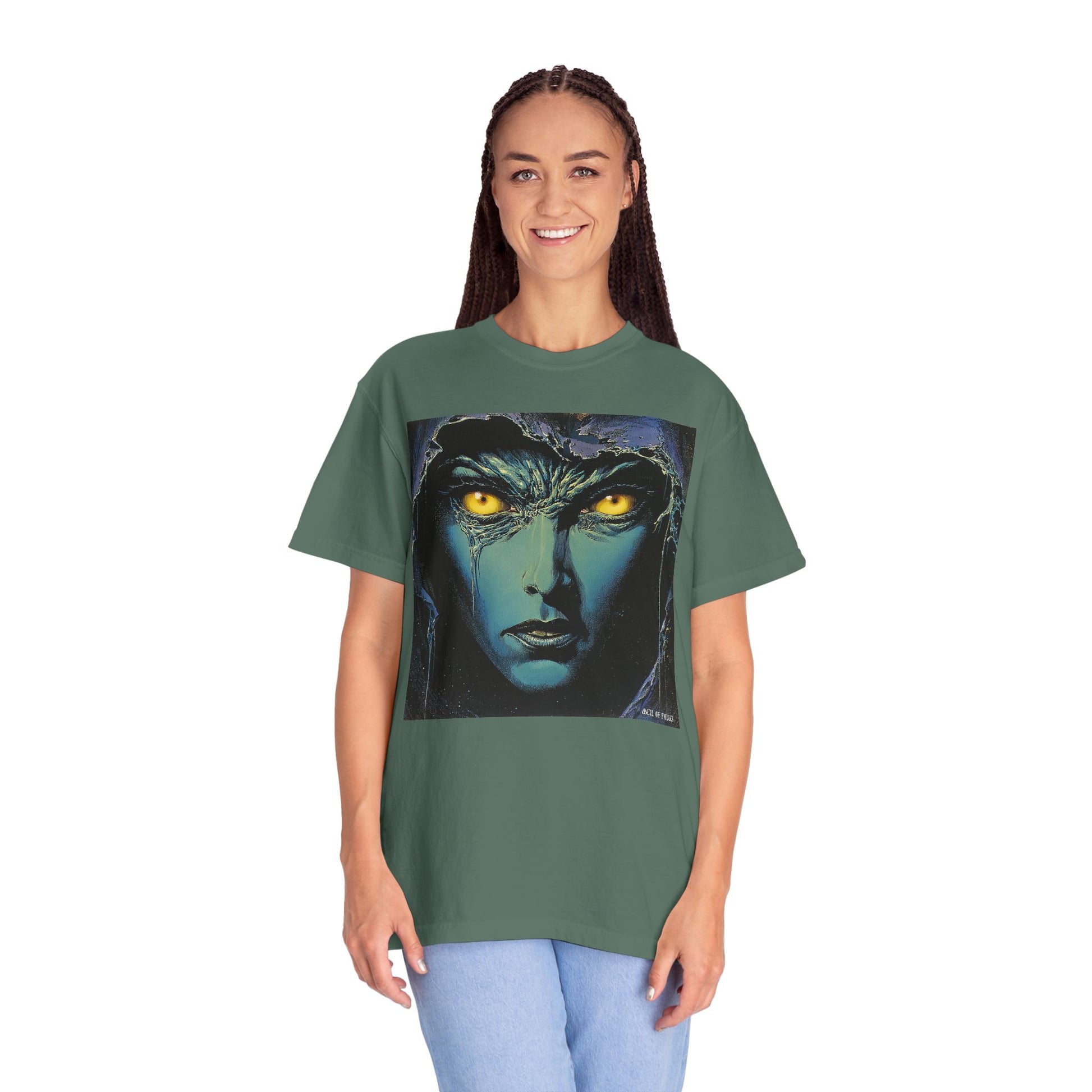 This shirt carries a quiet, edgy energy — a heavyweight, garment-dyed tee with a striking, cinematic face printed on the chest. The printed artwork’s glowing yellow eyes and shadowed teal skin draw the eye and hold it, giving the tee a mysterious, nocturnal vibe. It feels lived-in from the first wear: soft, slightly faded color from post-construction dyeing, with sturdy double-needle seams and a relaxed, roomy cut. Wear it to late-night shows, city walks, or when you want to add a brooding focal point to a layered outfit. The knit construction and pre-shrunk ring-spun cotton make it dependable wash after wash, while the sewn-in label and lack of side seams keep the silhouette clean and simple.