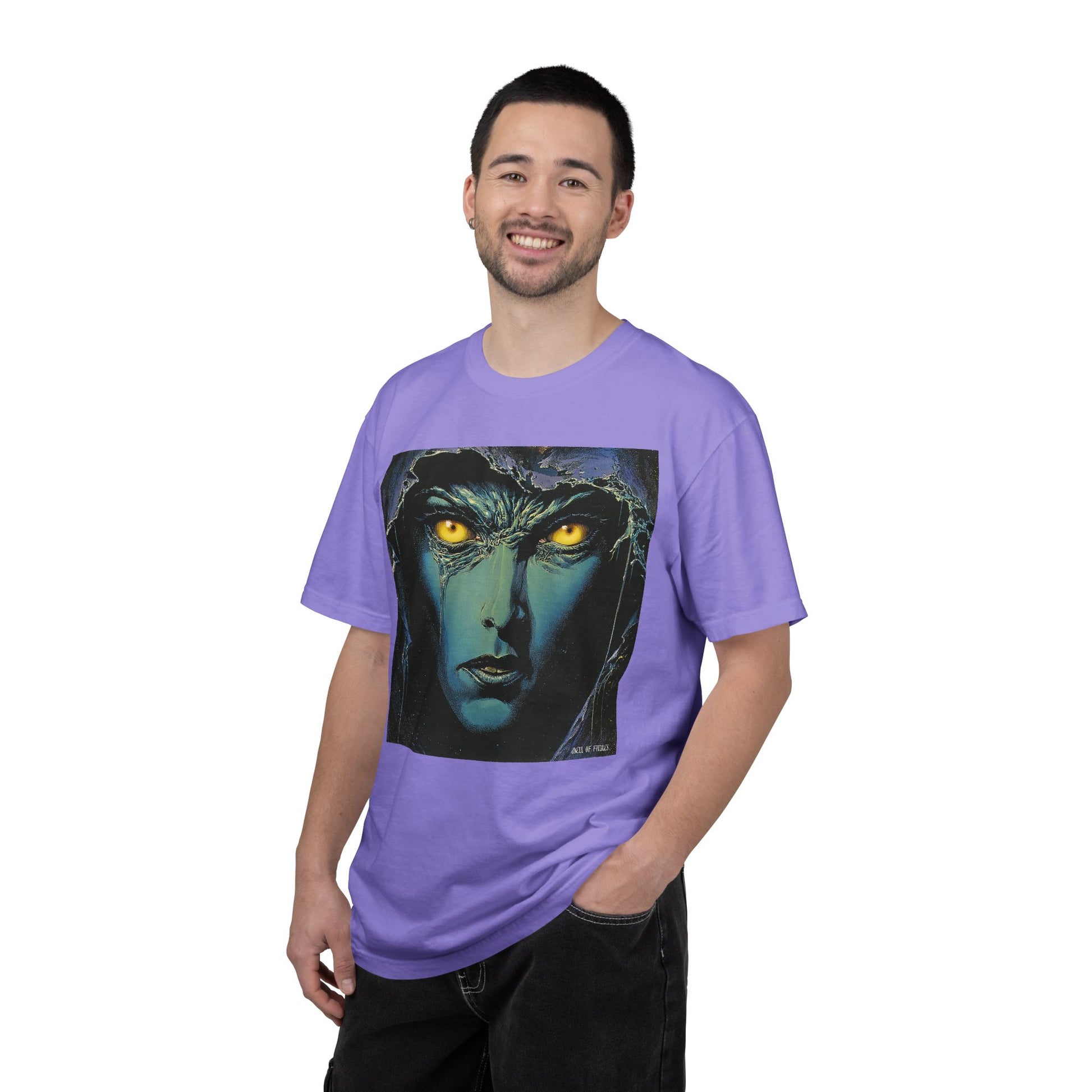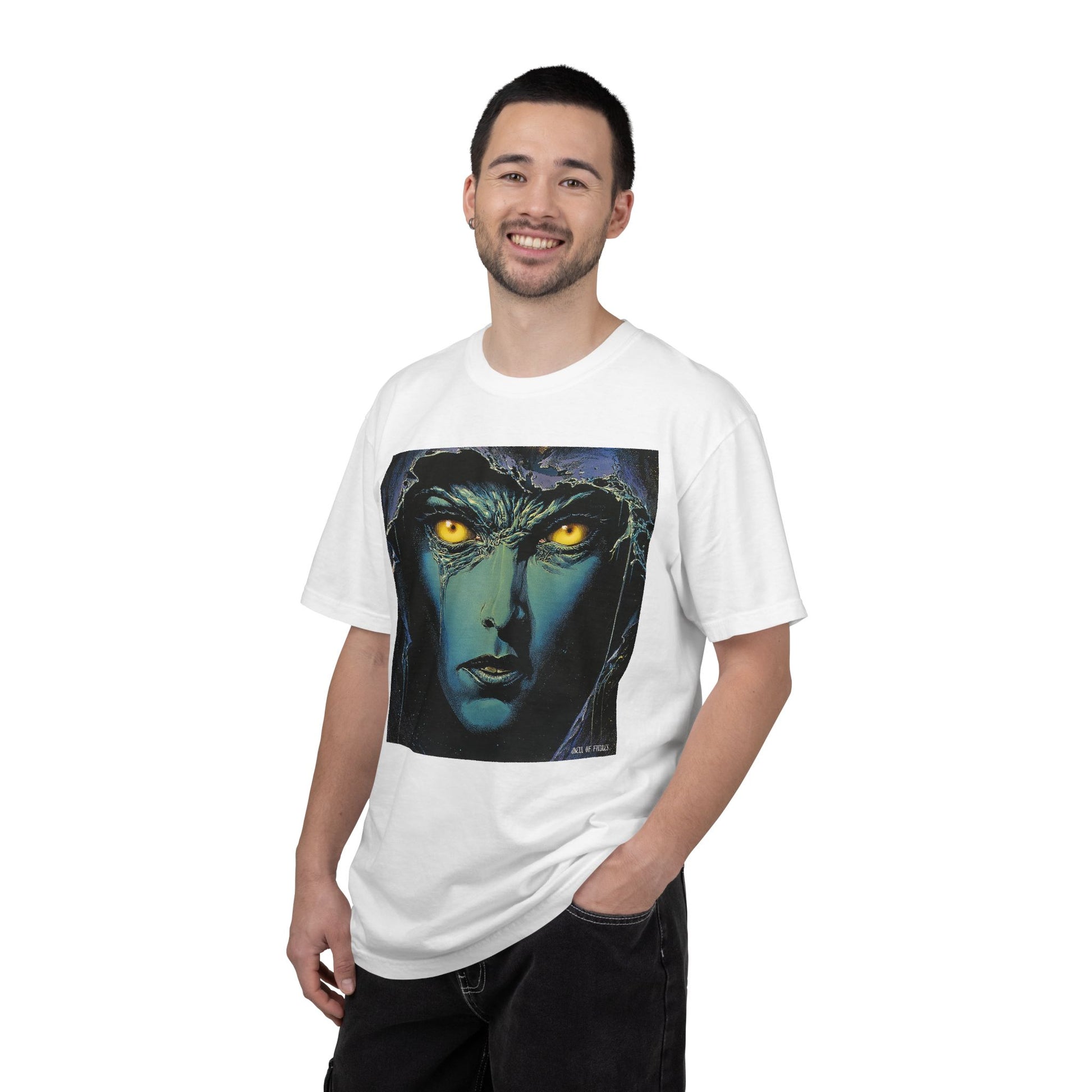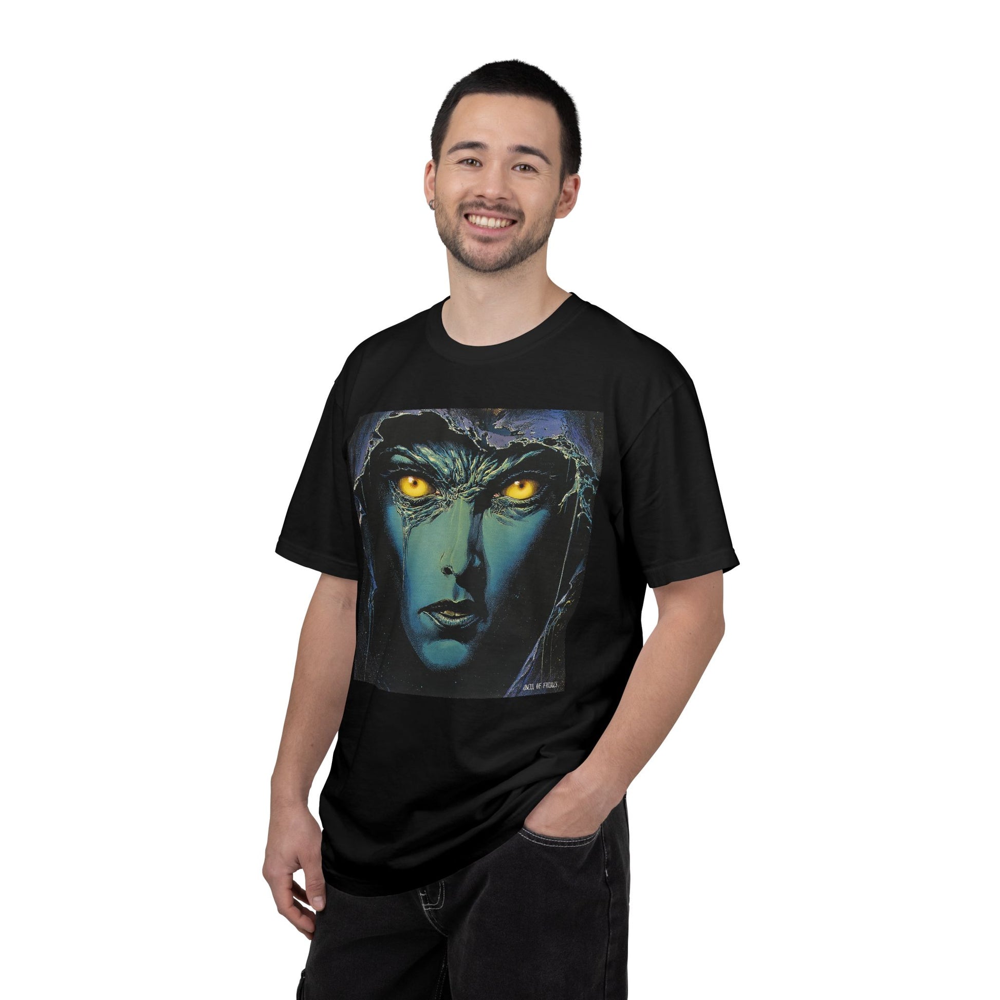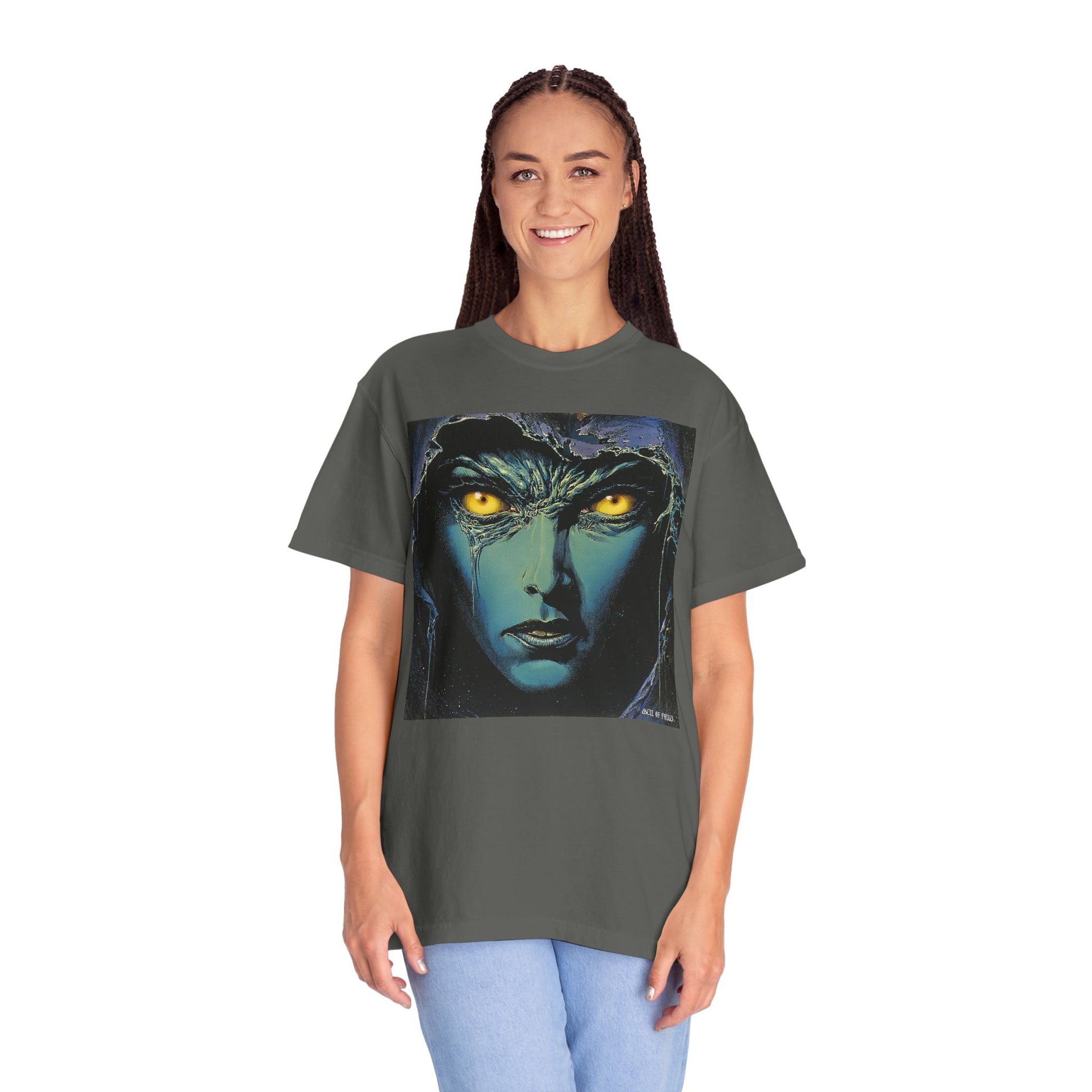 This shirt carries a quiet, edgy energy — a heavyweight, garment-dyed tee with a striking, cinematic face printed on the chest. The printed artwork’s glowing yellow eyes and shadowed teal skin draw the eye and hold it, giving the tee a mysterious, nocturnal vibe. It feels lived-in from the first wear: soft, slightly faded color from post-construction dyeing, with sturdy double-needle seams and a relaxed, roomy cut. Wear it to late-night shows, city walks, or when you want to add a brooding focal point to a layered outfit. The knit construction and pre-shrunk ring-spun cotton make it dependable wash after wash, while the sewn-in label and lack of side seams keep the silhouette clean and simple.