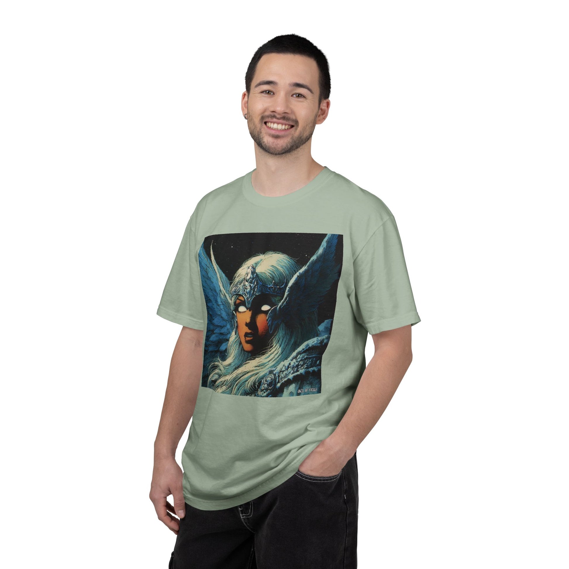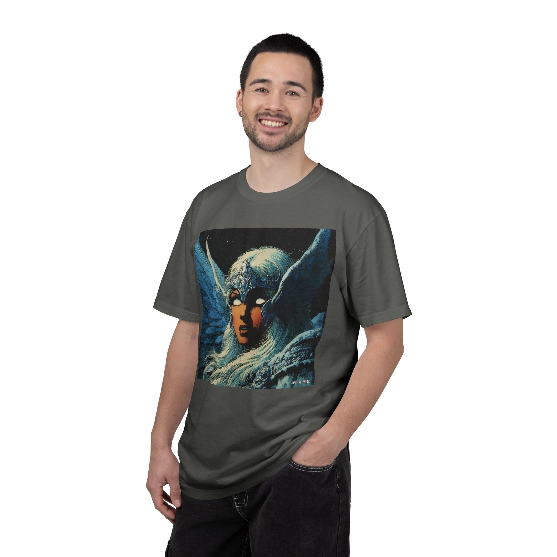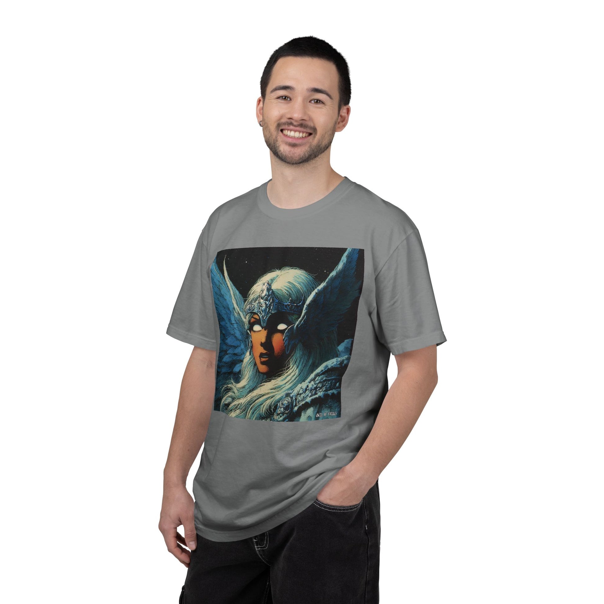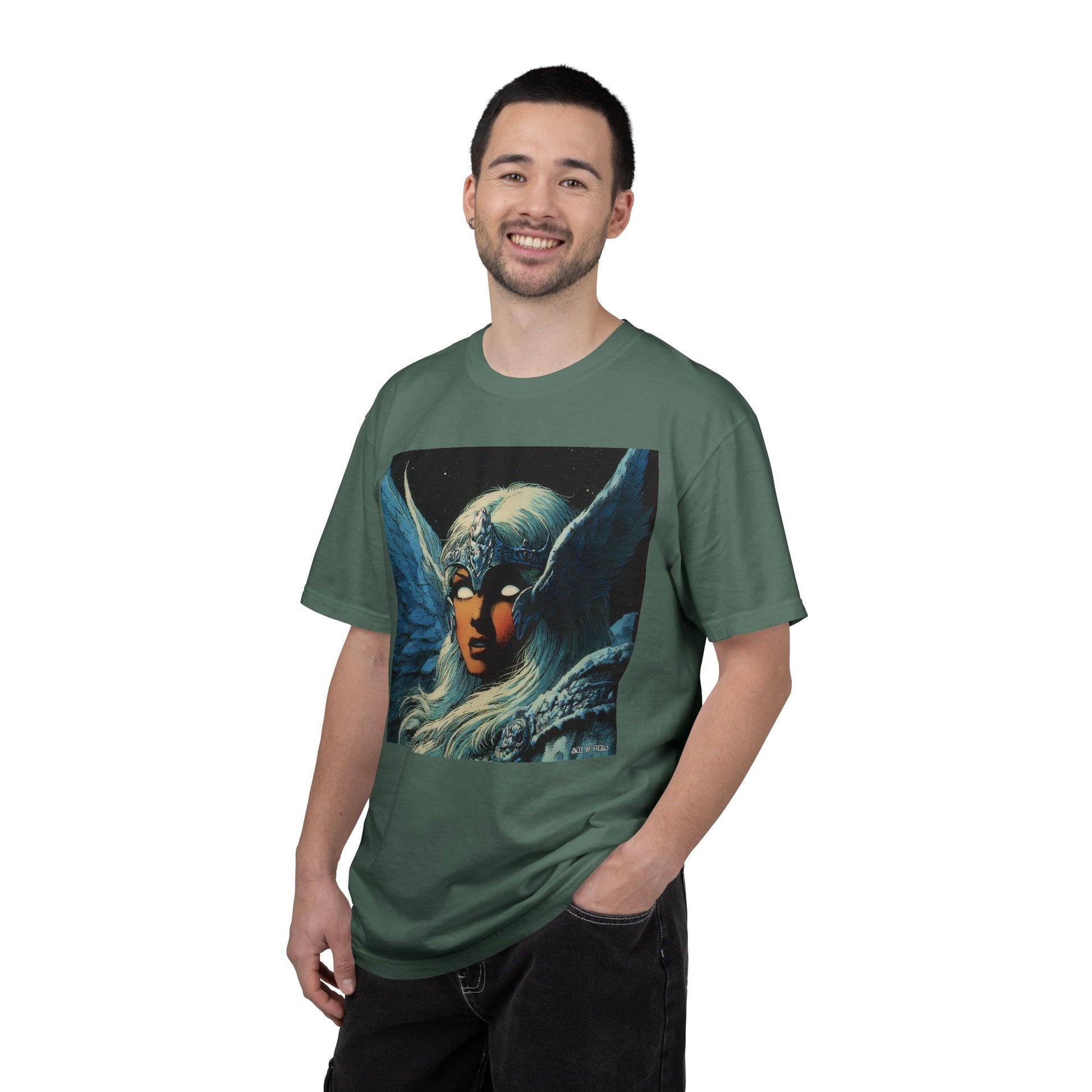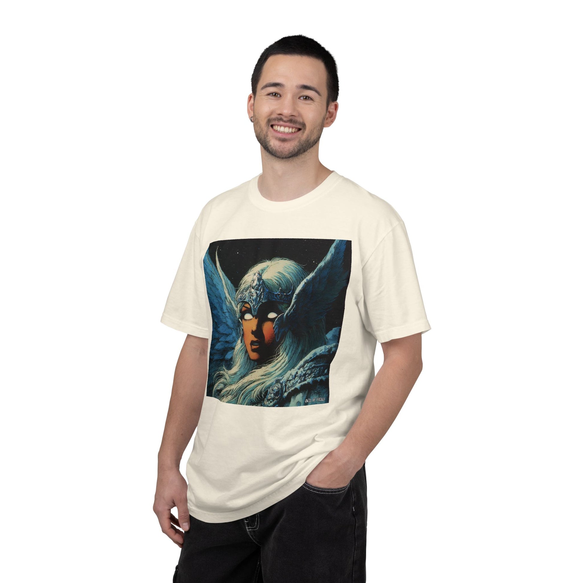 This garment-dyed tee carries a spellbound, comic-inspired portrait across the chest — a moonlit warrior with winged helmet, pale hair, and an otherworldly stare. The heavyweight cotton has a lived-in softness from the post-construction dye, so the image sits on a rich, textured canvas that feels as vintage as the artwork itself. Wear it on cool nights or layered under a jacket for city walks, shows, or quiet hours with sketchbooks and records. It’s for people who collect stories on fabric: fans of classic fantasy illustration, retro comics, and bold, atmospheric art. The relaxed fit and substantial weight let the shirt hold its shape while letting the printed scene do the talking.