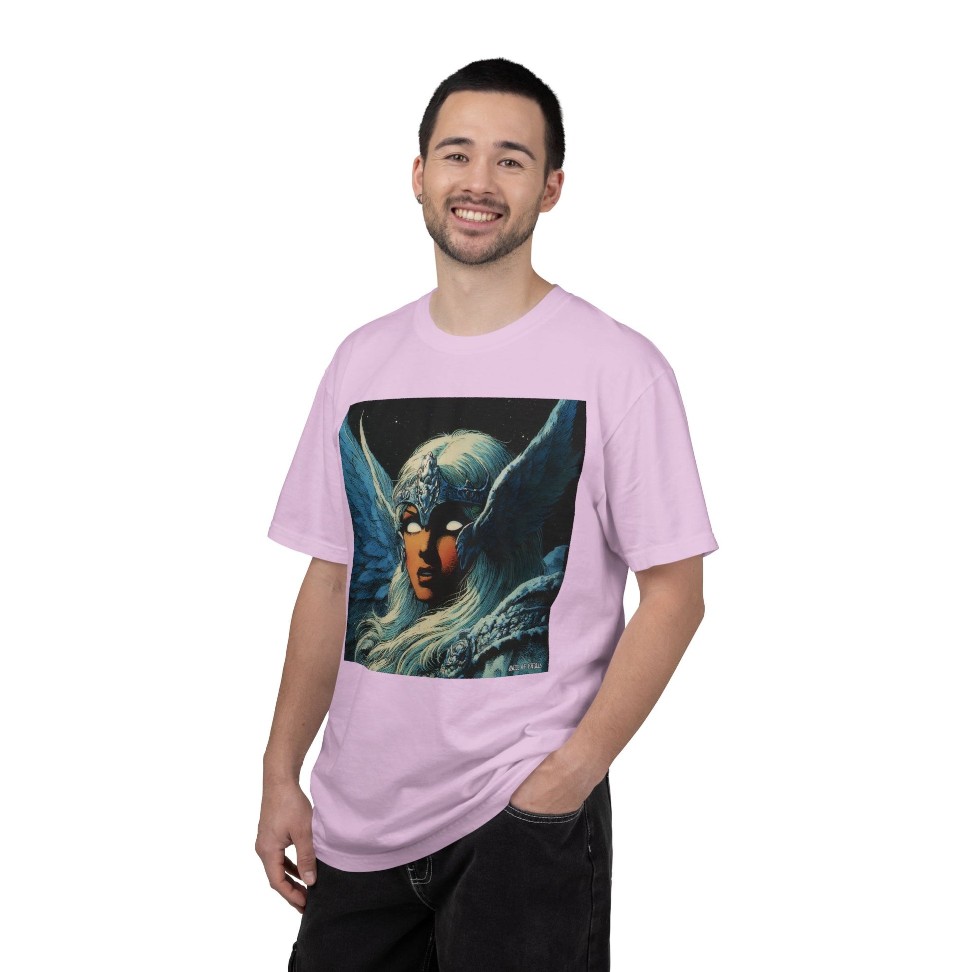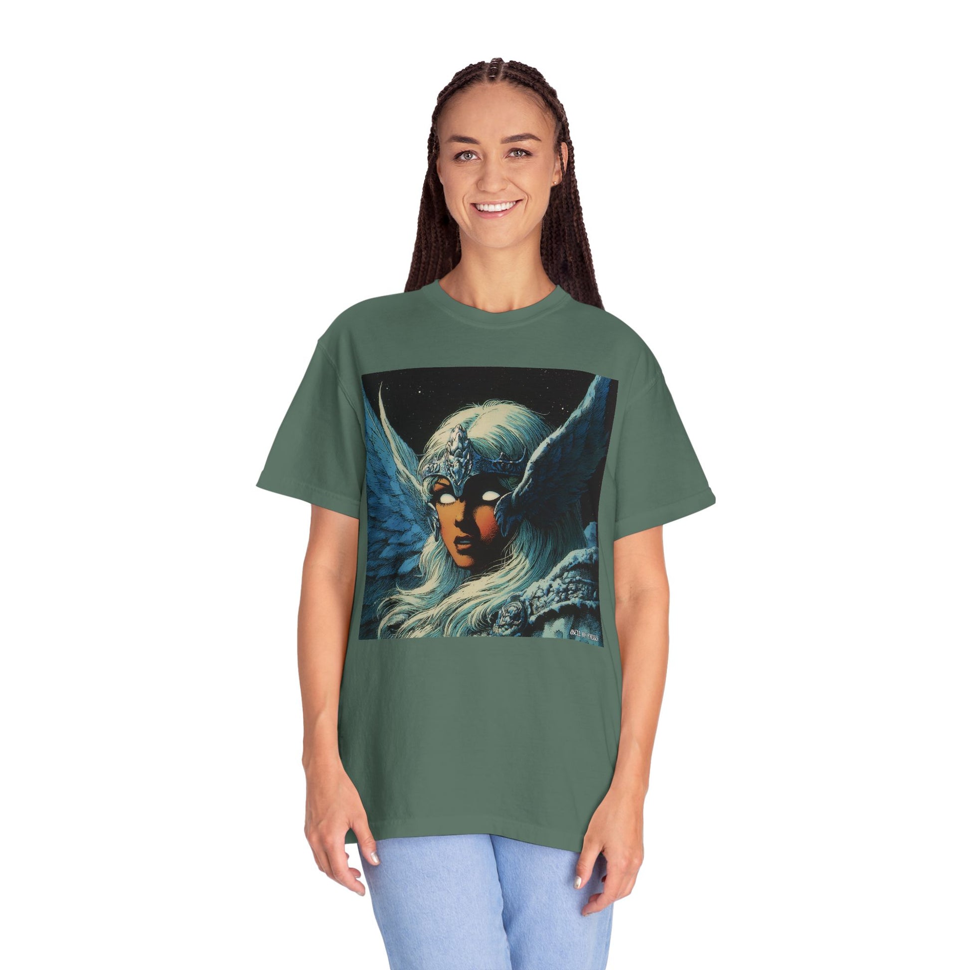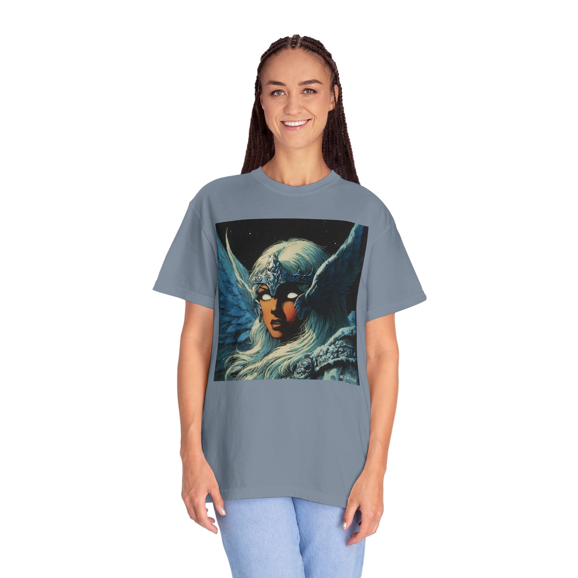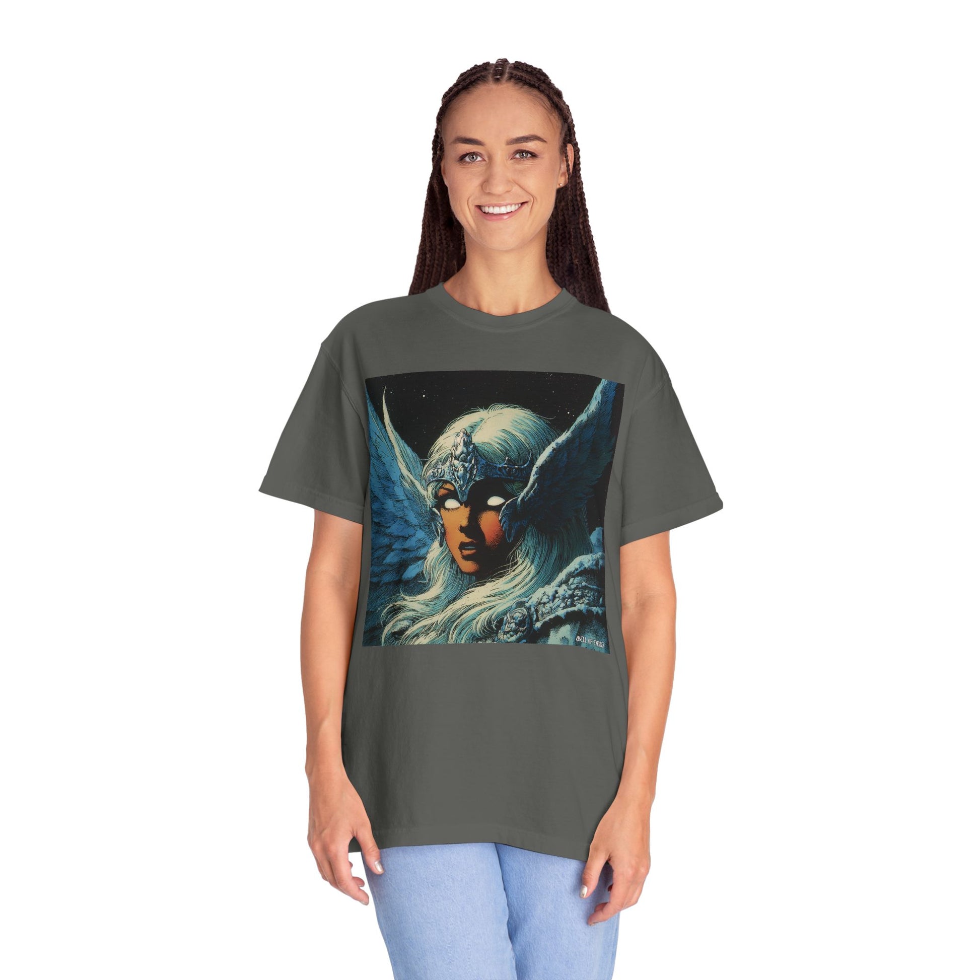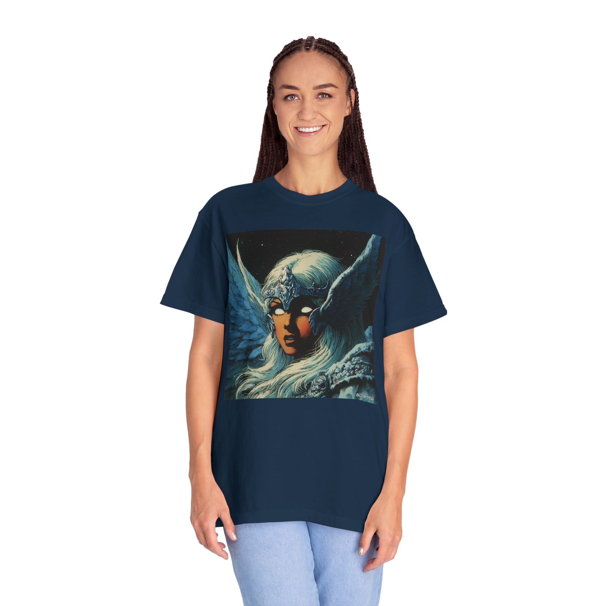This garment-dyed tee carries a spellbound, comic-inspired portrait across the chest — a moonlit warrior with winged helmet, pale hair, and an otherworldly stare. The heavyweight cotton has a lived-in softness from the post-construction dye, so the image sits on a rich, textured canvas that feels as vintage as the artwork itself. Wear it on cool nights or layered under a jacket for city walks, shows, or quiet hours with sketchbooks and records. It’s for people who collect stories on fabric: fans of classic fantasy illustration, retro comics, and bold, atmospheric art. The relaxed fit and substantial weight let the shirt hold its shape while letting the printed scene do the talking.
