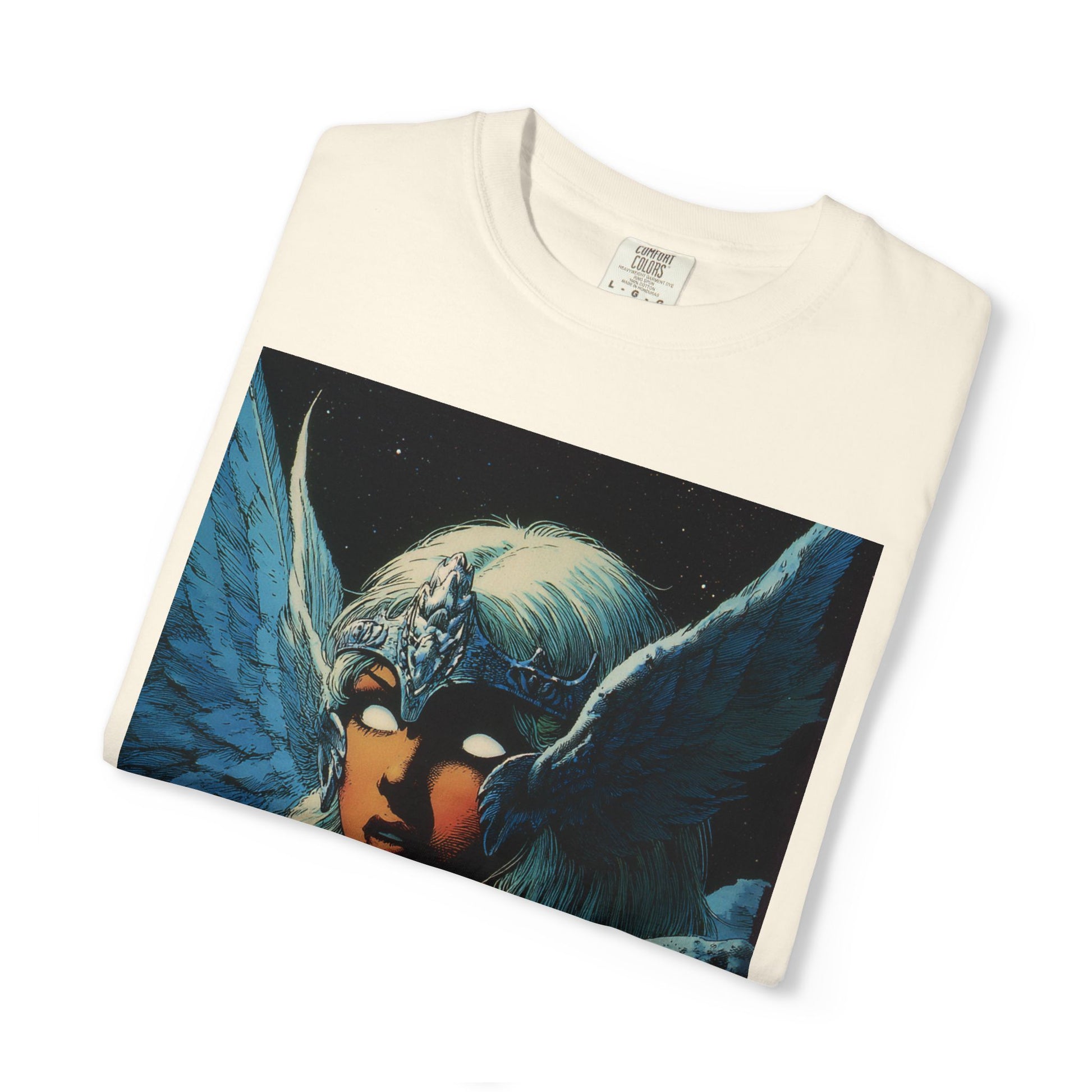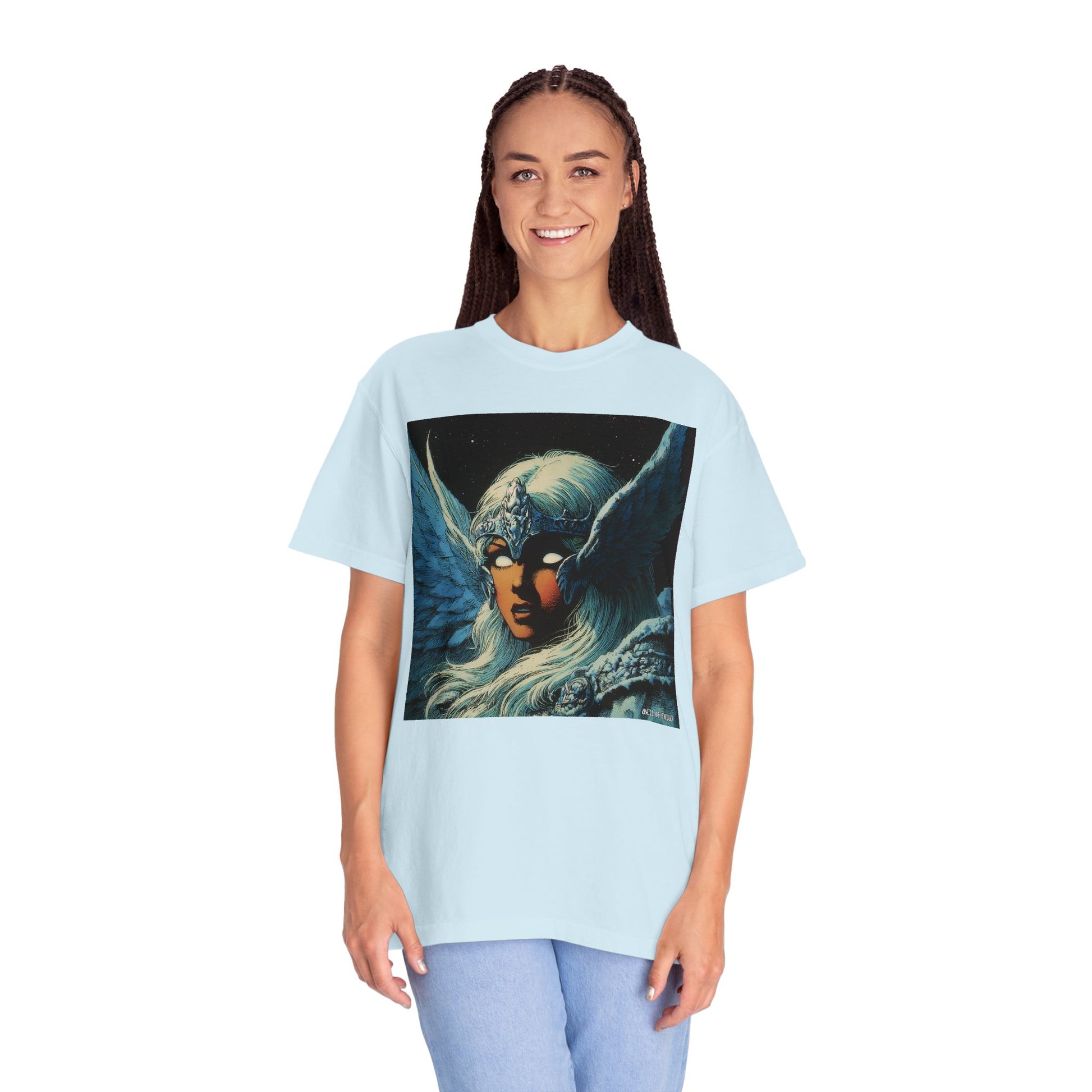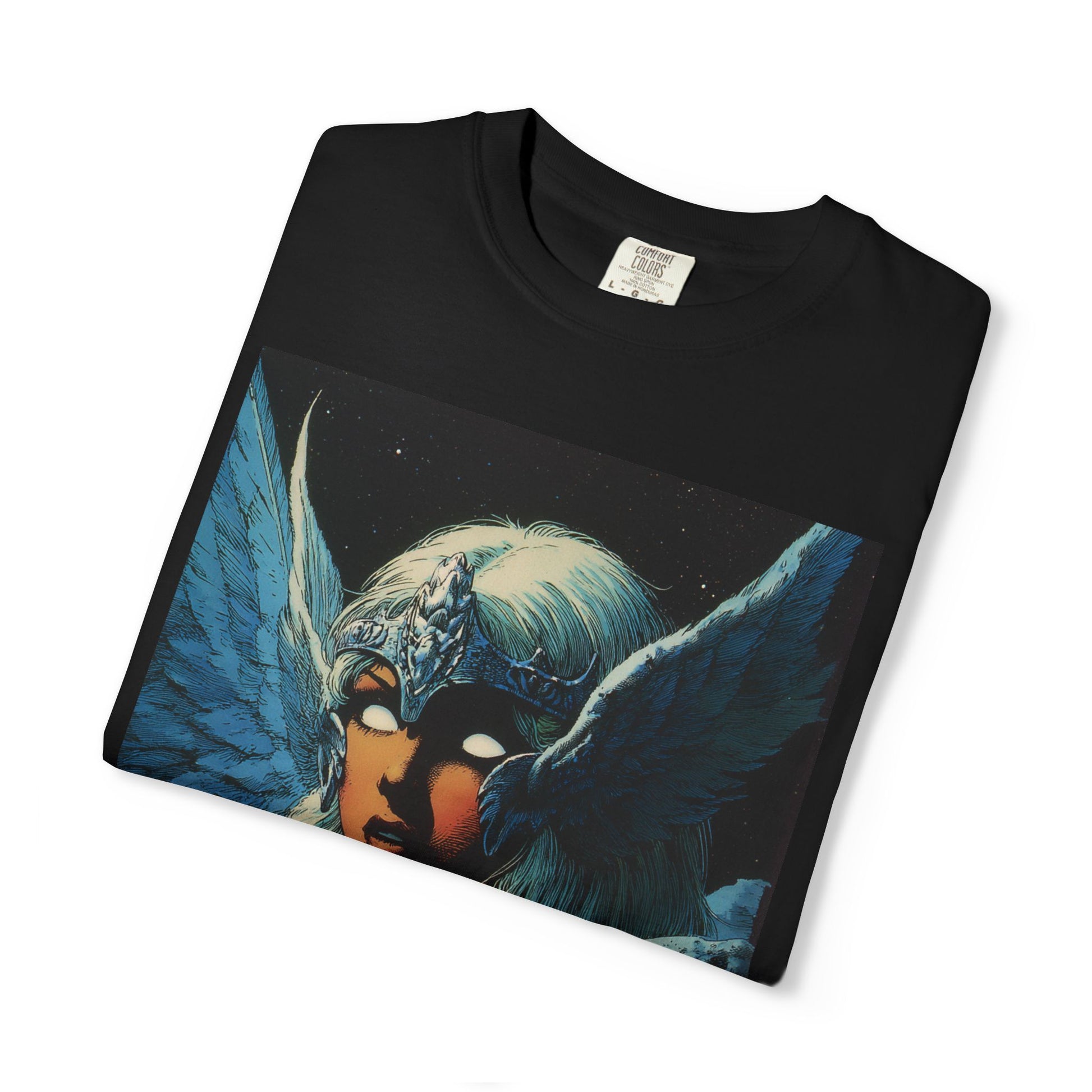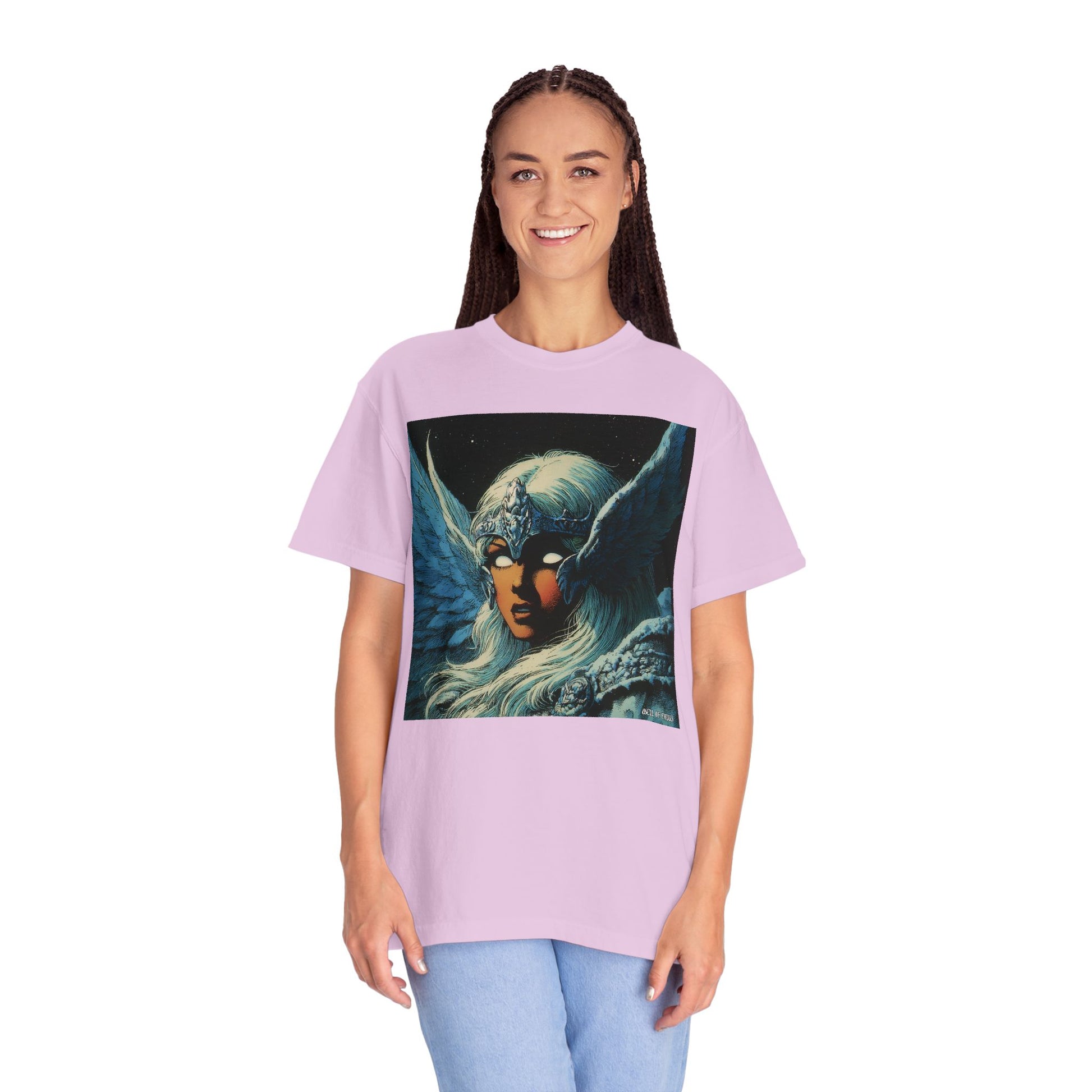 This garment-dyed tee carries a spellbound, comic-inspired portrait across the chest — a moonlit warrior with winged helmet, pale hair, and an otherworldly stare. The heavyweight cotton has a lived-in softness from the post-construction dye, so the image sits on a rich, textured canvas that feels as vintage as the artwork itself. Wear it on cool nights or layered under a jacket for city walks, shows, or quiet hours with sketchbooks and records. It’s for people who collect stories on fabric: fans of classic fantasy illustration, retro comics, and bold, atmospheric art. The relaxed fit and substantial weight let the shirt hold its shape while letting the printed scene do the talking.