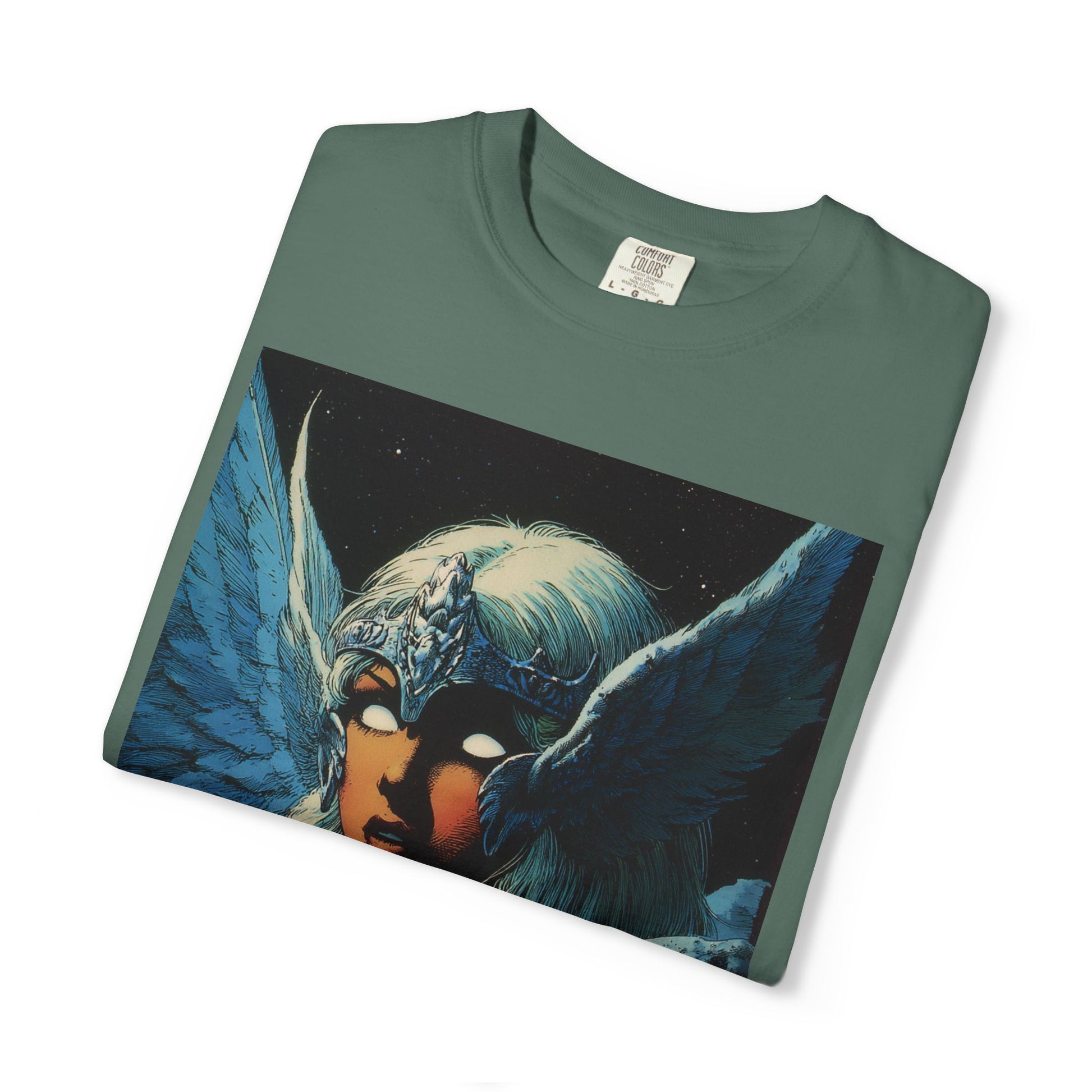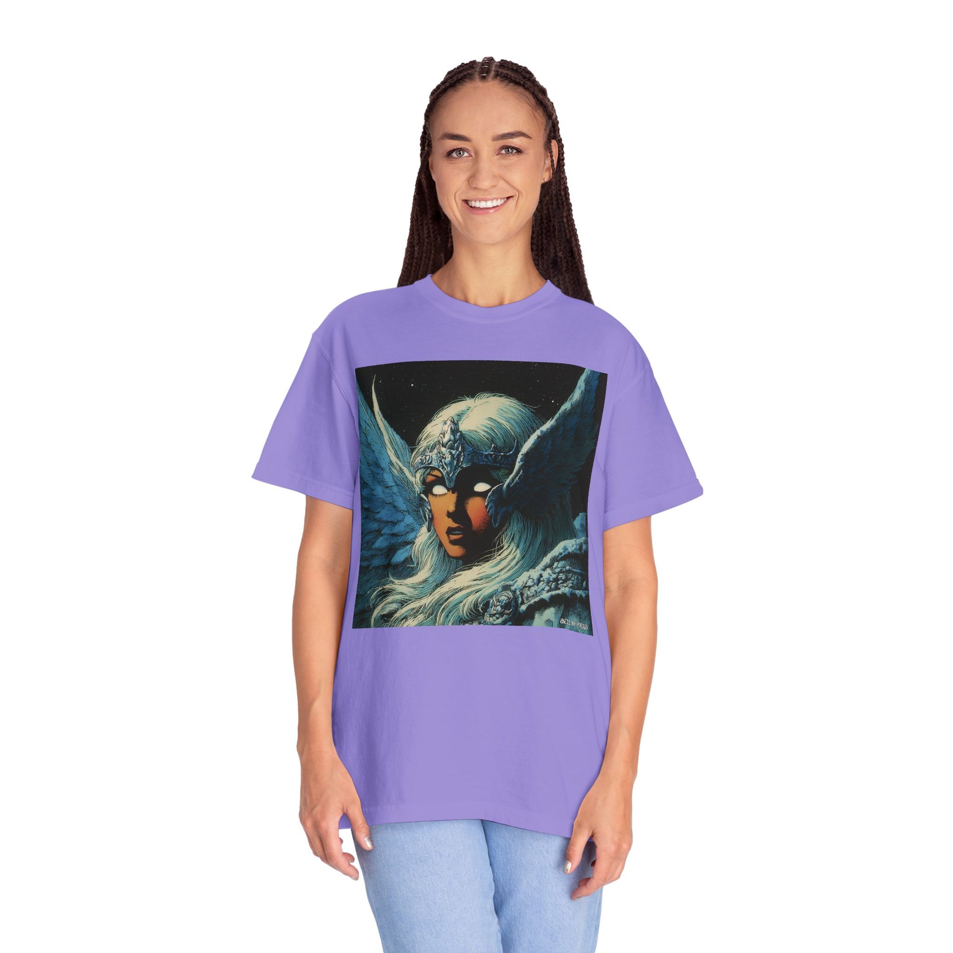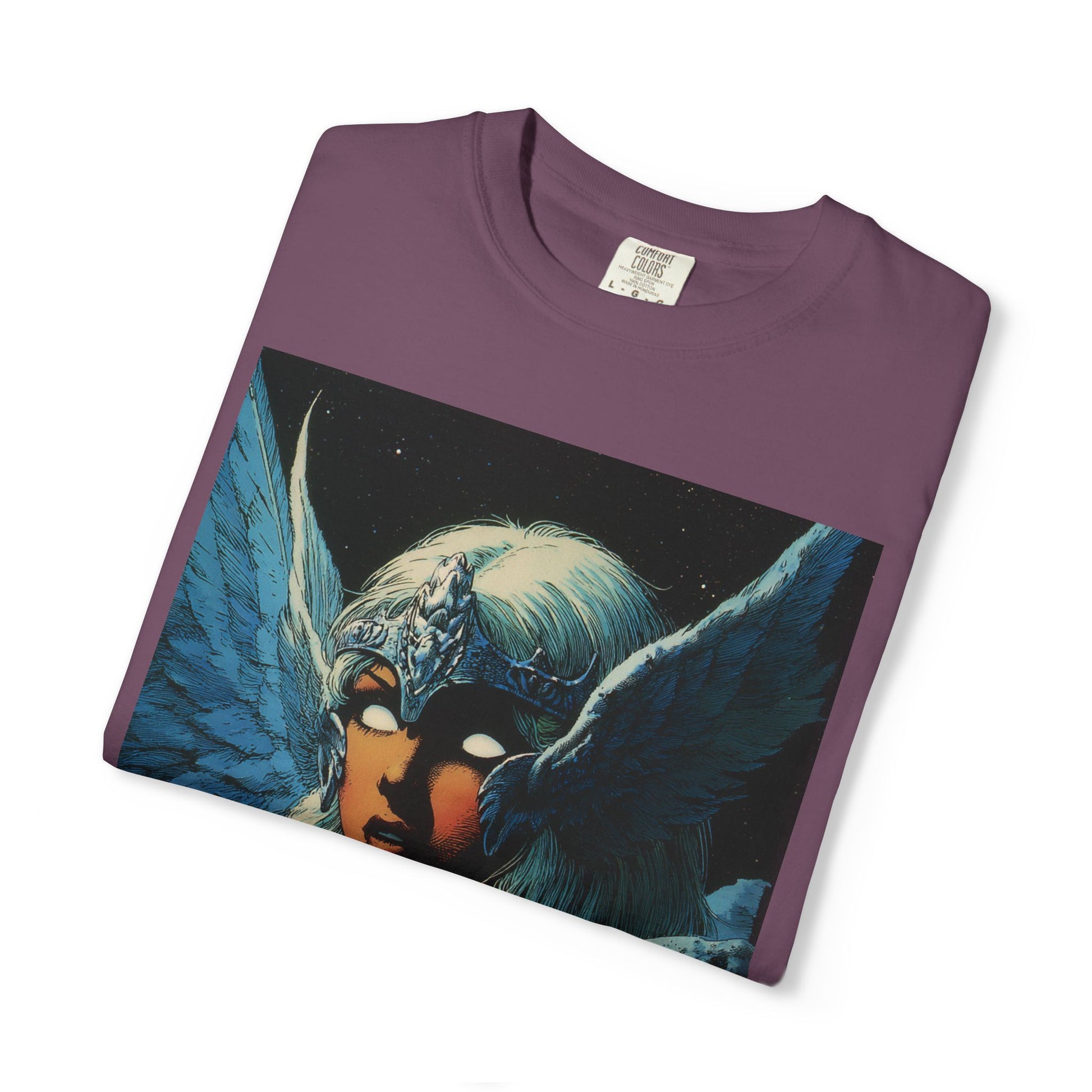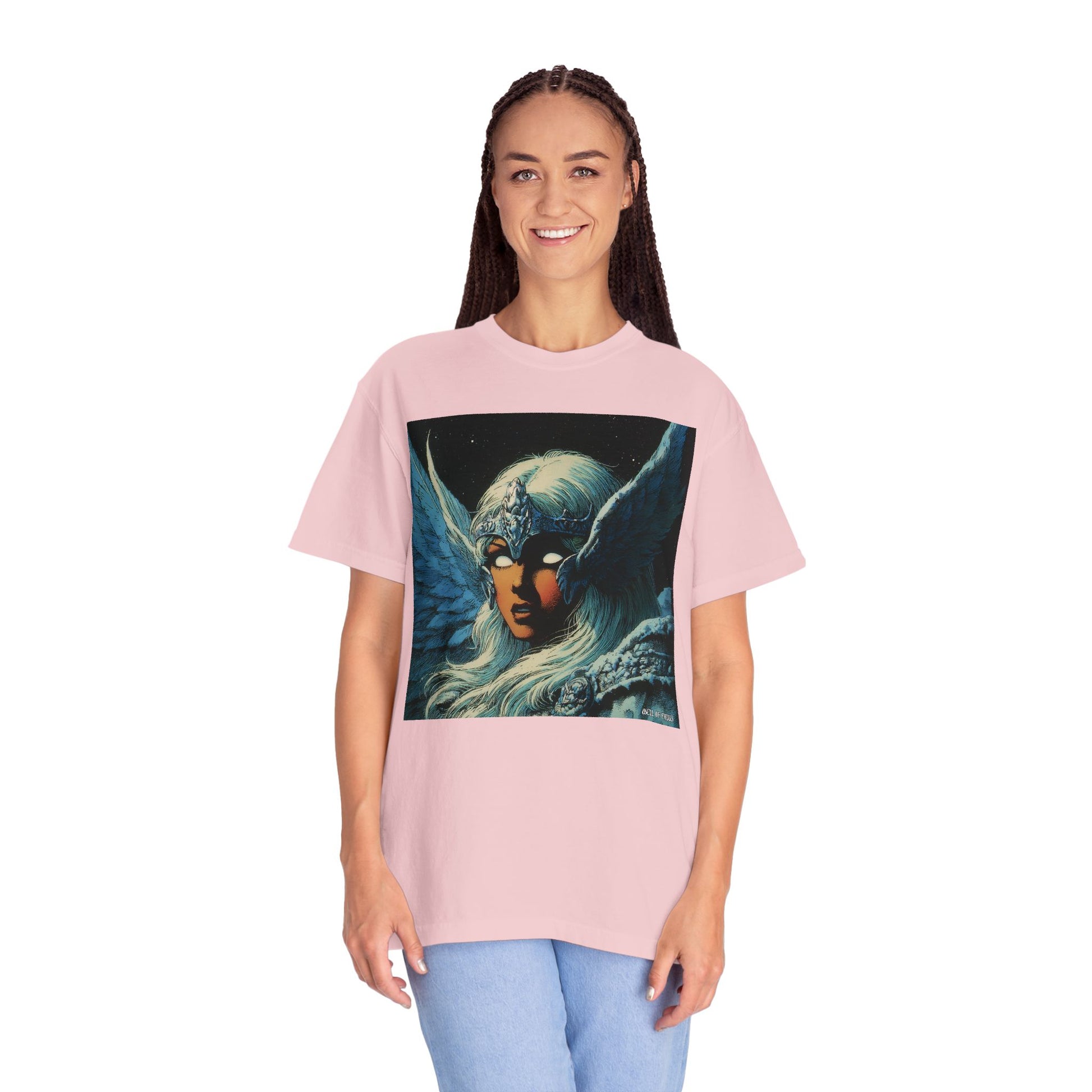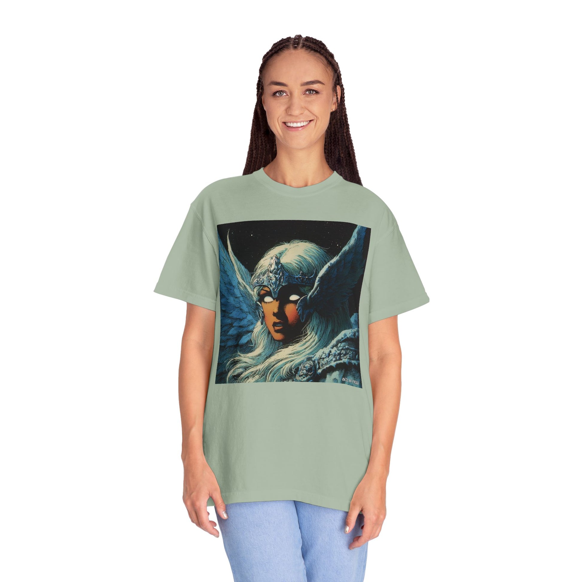 This garment-dyed tee carries a spellbound, comic-inspired portrait across the chest — a moonlit warrior with winged helmet, pale hair, and an otherworldly stare. The heavyweight cotton has a lived-in softness from the post-construction dye, so the image sits on a rich, textured canvas that feels as vintage as the artwork itself. Wear it on cool nights or layered under a jacket for city walks, shows, or quiet hours with sketchbooks and records. It’s for people who collect stories on fabric: fans of classic fantasy illustration, retro comics, and bold, atmospheric art. The relaxed fit and substantial weight let the shirt hold its shape while letting the printed scene do the talking.