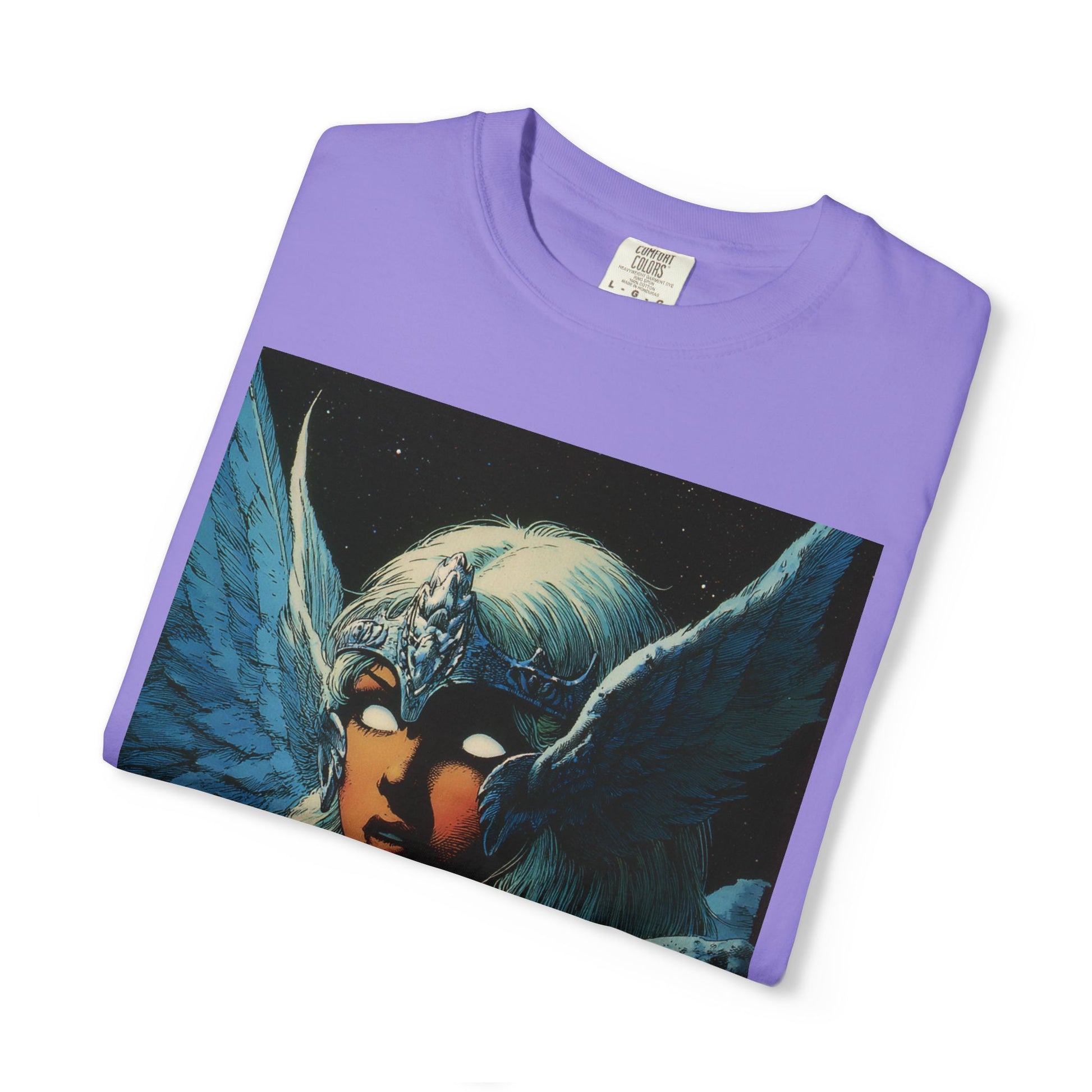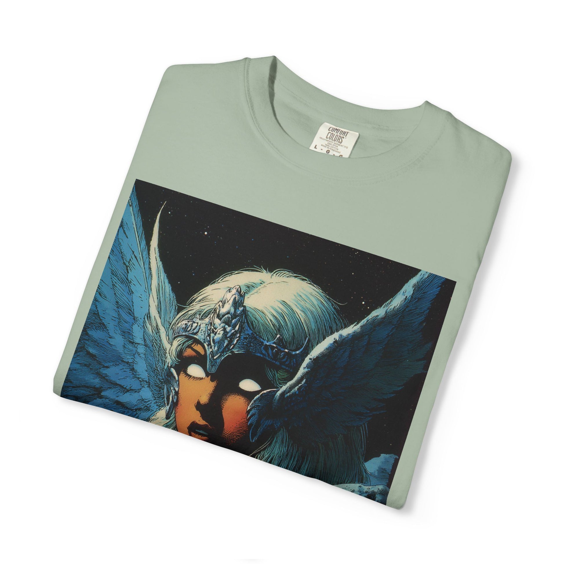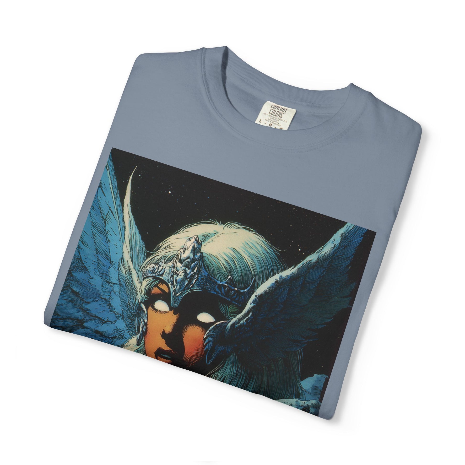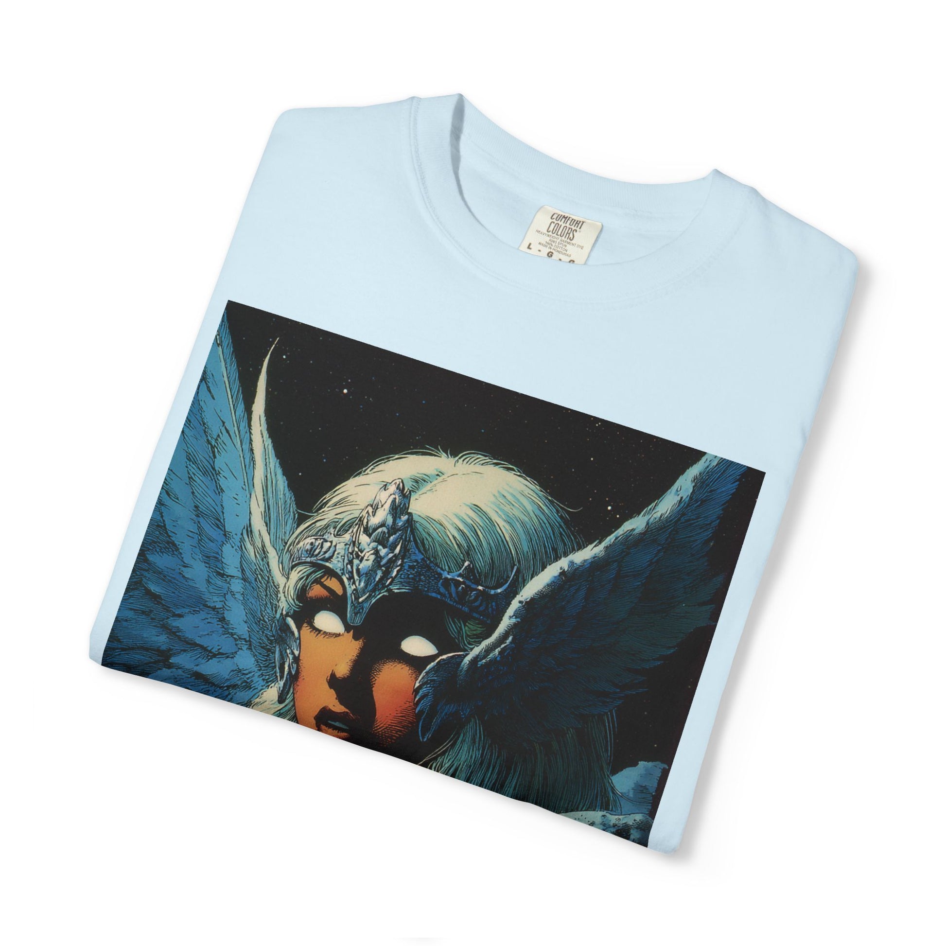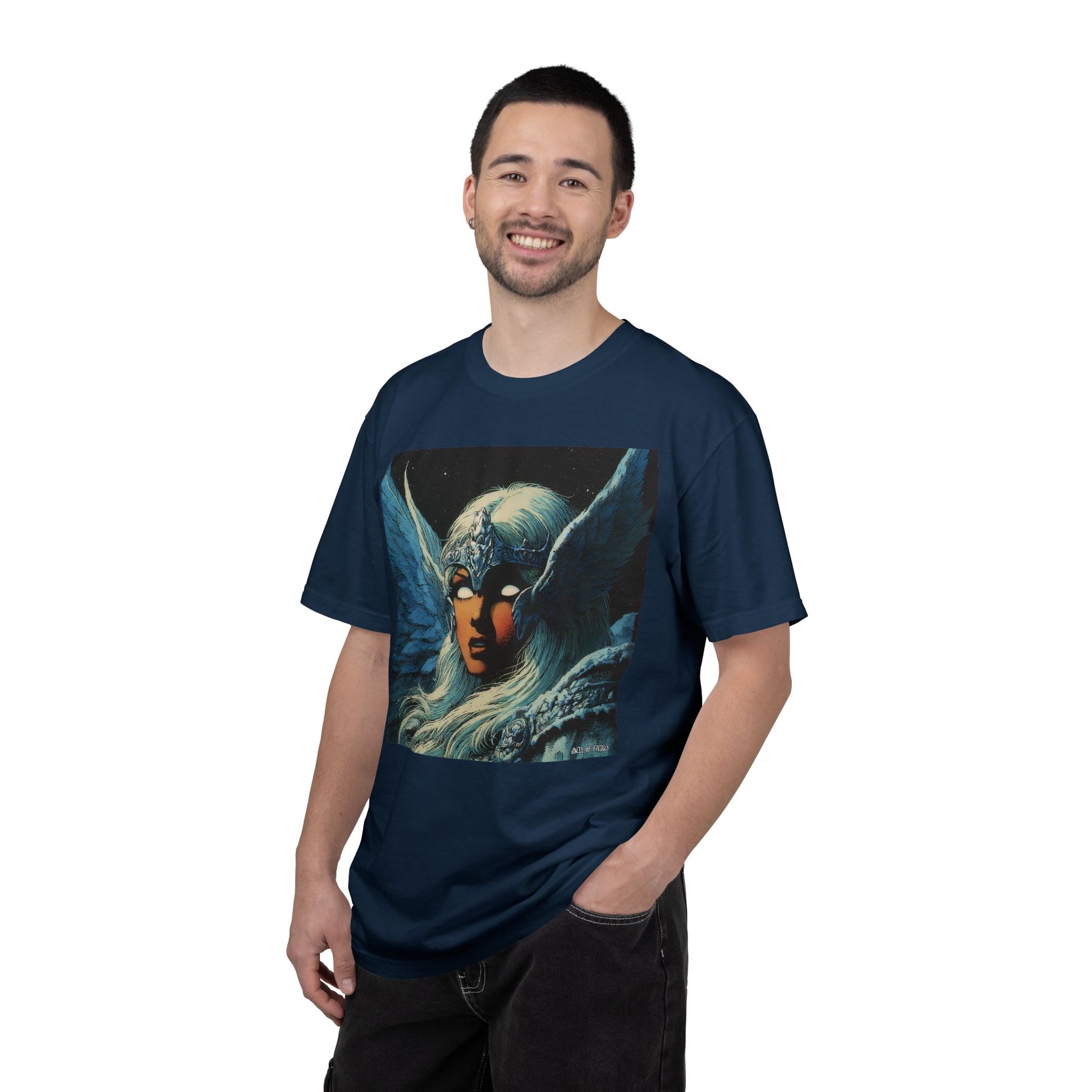 This garment-dyed tee carries a spellbound, comic-inspired portrait across the chest — a moonlit warrior with winged helmet, pale hair, and an otherworldly stare. The heavyweight cotton has a lived-in softness from the post-construction dye, so the image sits on a rich, textured canvas that feels as vintage as the artwork itself. Wear it on cool nights or layered under a jacket for city walks, shows, or quiet hours with sketchbooks and records. It’s for people who collect stories on fabric: fans of classic fantasy illustration, retro comics, and bold, atmospheric art. The relaxed fit and substantial weight let the shirt hold its shape while letting the printed scene do the talking.